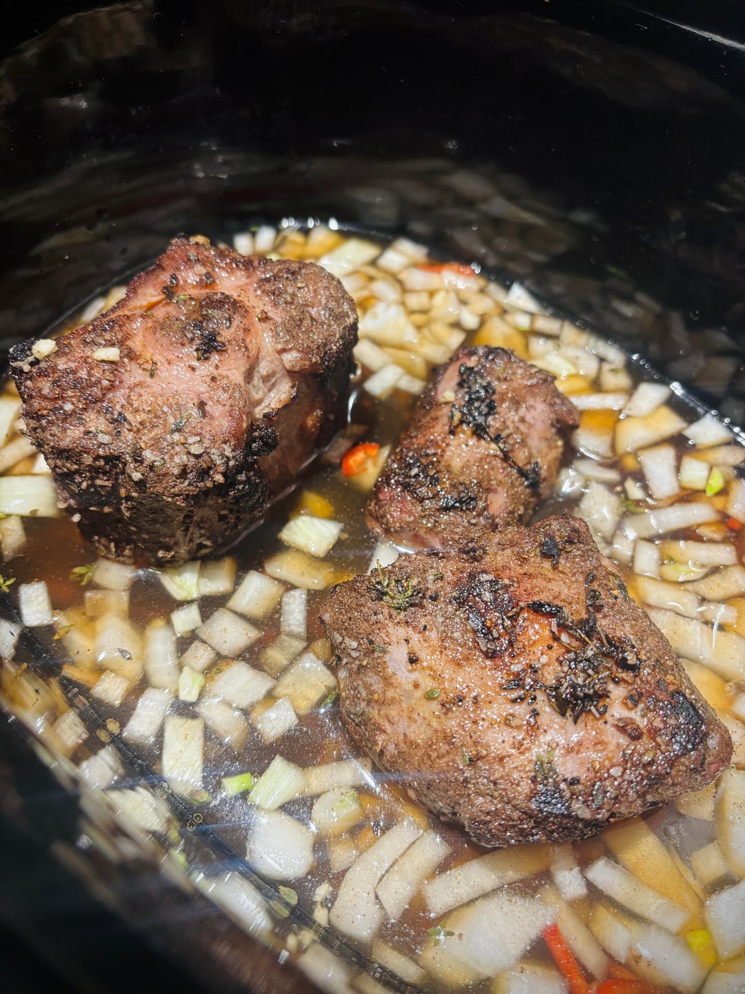 Seared on the stovetop for 2-3 minutes per side until I had a crust, then placed into the cooker with 1/2 a diced onion, 3 minced garlic cloves, half of small red jalapeño (I was worried about heat but that was silly, I could’ve used the whole thing), beef broth, and a splash of soy sauce. Set for 8 hours on low.