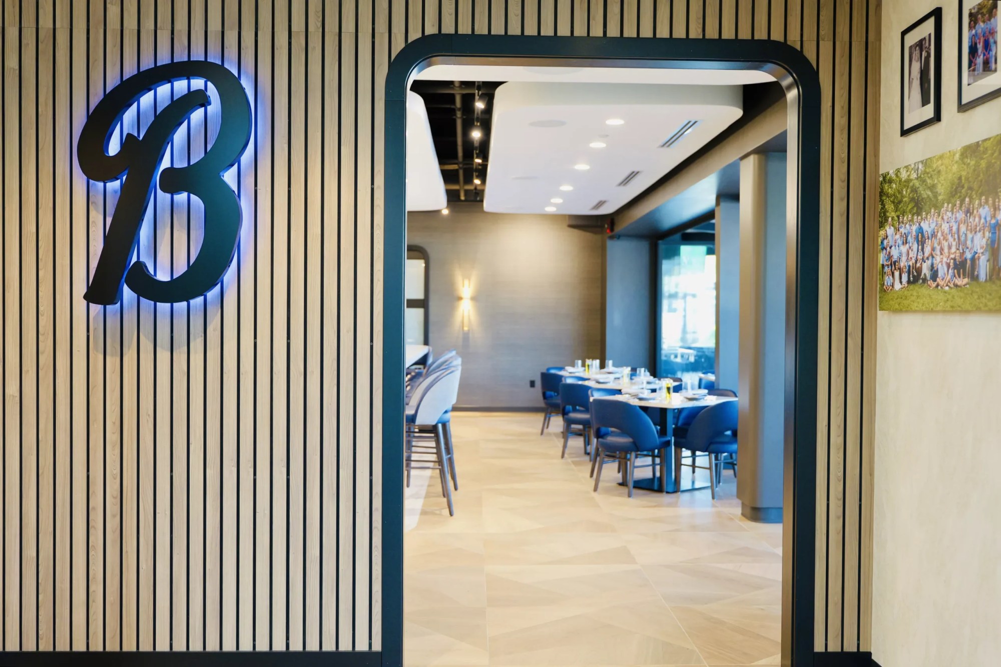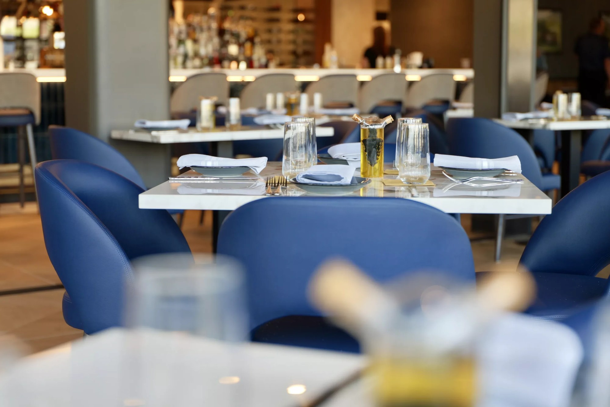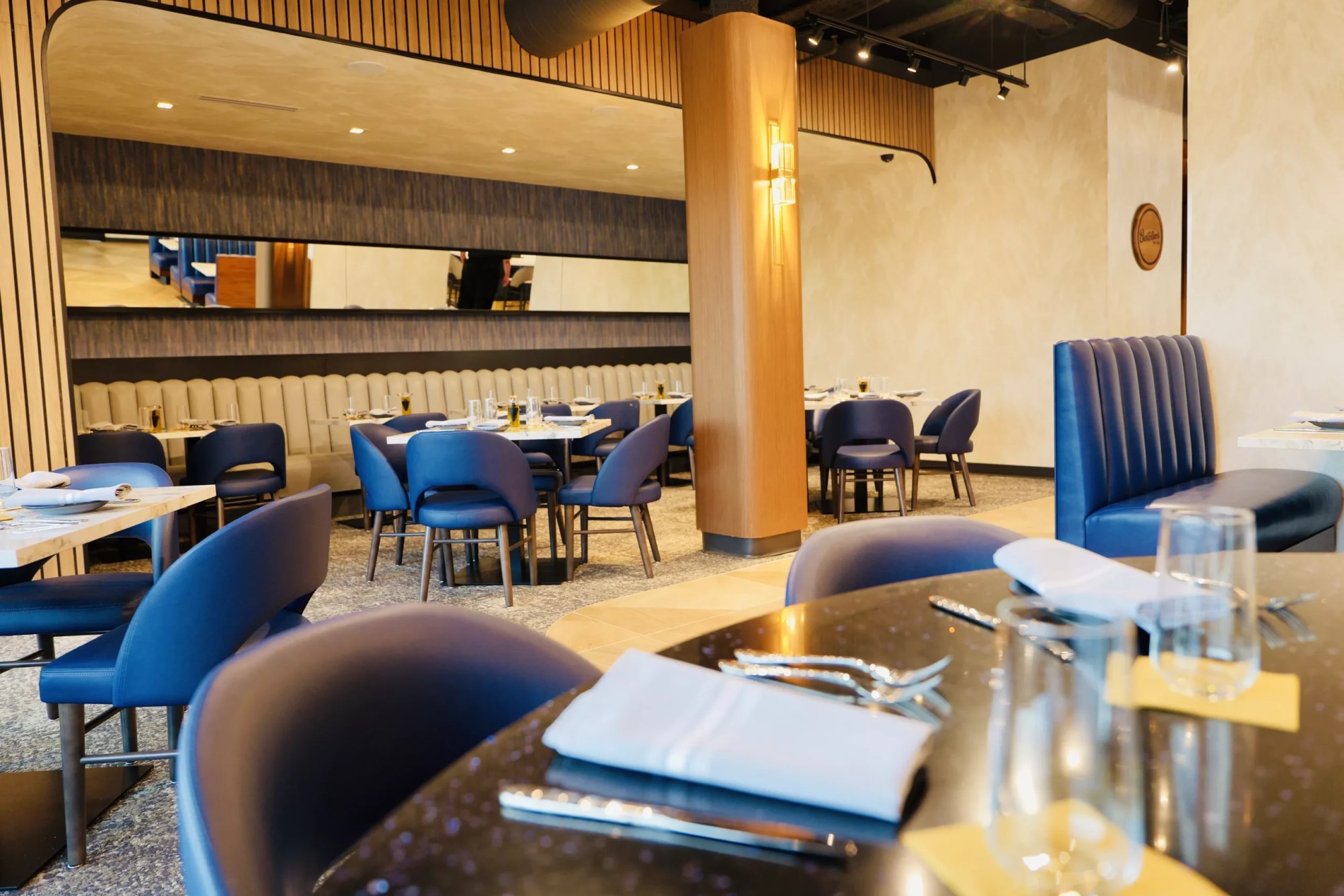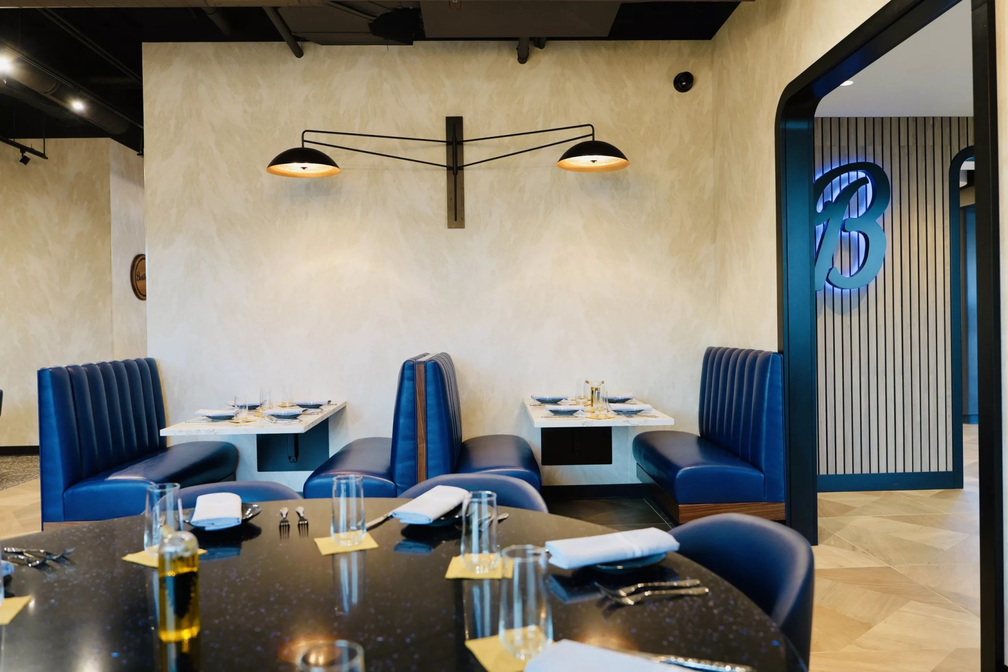 Spanning around 6,600 square feet with seating for up to 250 guests, the space harmonizes modern and timeless design. Rich blue and gold accents, white stone tables, and a lively bar set the scene for an upbeat atmosphere. They will have live music on the weekends in the bar area, adding even more energy to the space.