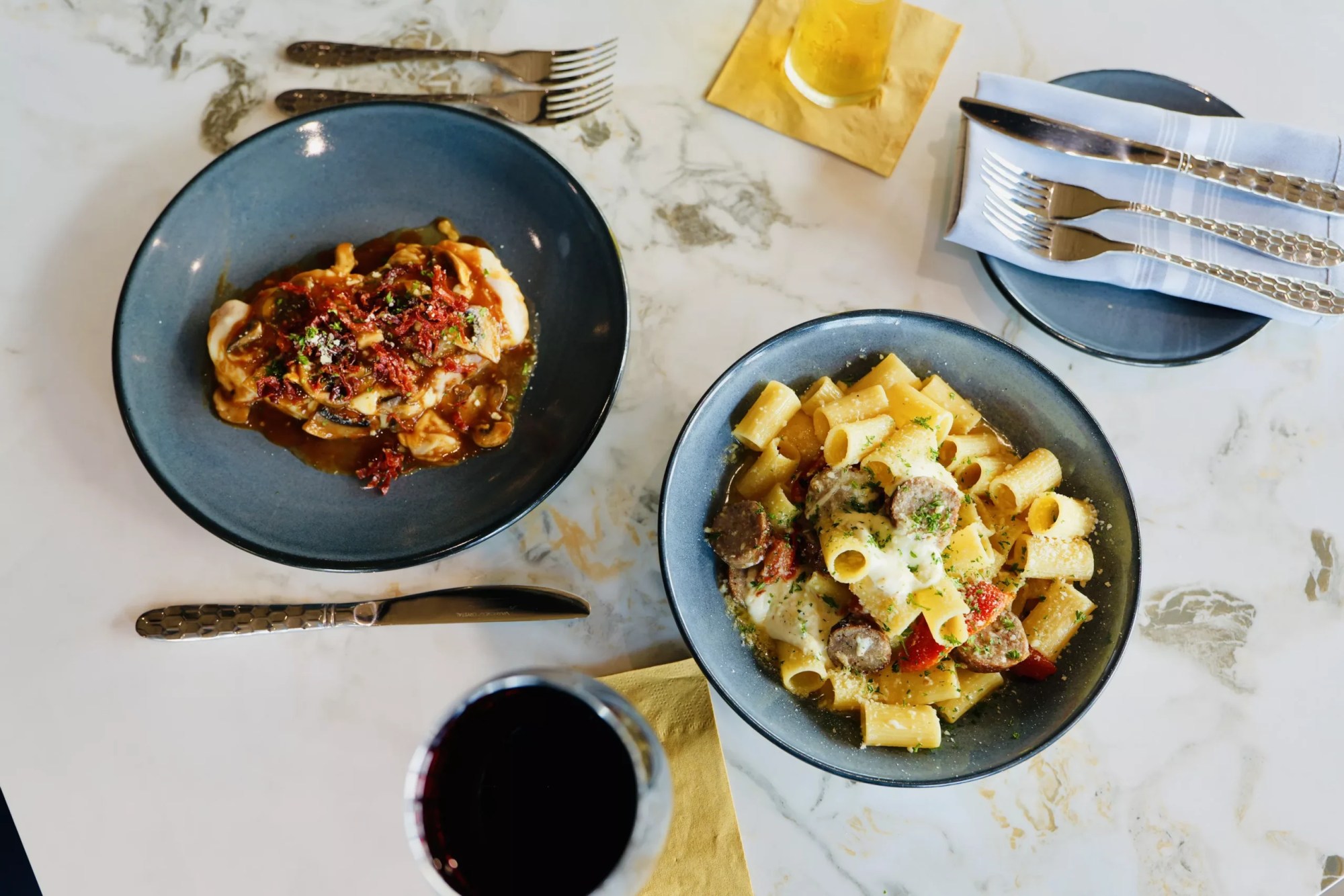 The rigatoni caprese is made with Italian sausage, roasted tomatoes, basil, burrata, olive oil and garlic. Credit: photo by Braden TewoldeThe Chicken Michael, left, and and rigatoni caprese. Credit: photo by Braden TewoldeCredit: photo by Braden Tewolde