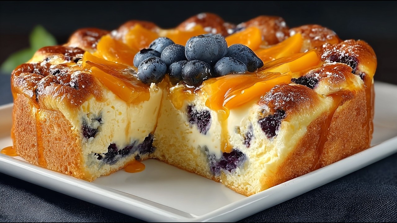 in the comments from 0 to 10! That means a lot to me. ½ cup (110 g) melted butter. Do you like fresh pastries? I will share simple recipes with you. 1 cup (130 g) flour. 1 teaspoon baking powder. A pinch of salt. How often do you bake homemade cakes? My family loves homemade sweets. Grease with vegetable oil. Spread the dough evenly. 1¼ cups (275 g) cottage cheese. Pour water over it. Cook for 2-3 minutes. 1¼ cups (275 g) cottage cheese. 2 tablespoons sour cream. 3 eggs. Puree with a hand blender. 3 tbsp (45 g) sugar or sweetener. 1/4 tsp vanillin. Lay out the pumpkin. 1 cup (150 g) blueberries. Bake at 180°C (350°F) for 40–50 minutes. I let the cake cool. Everyone will love this dessert. Thanks for your subscriptions, likes and comments! Bon appetit!