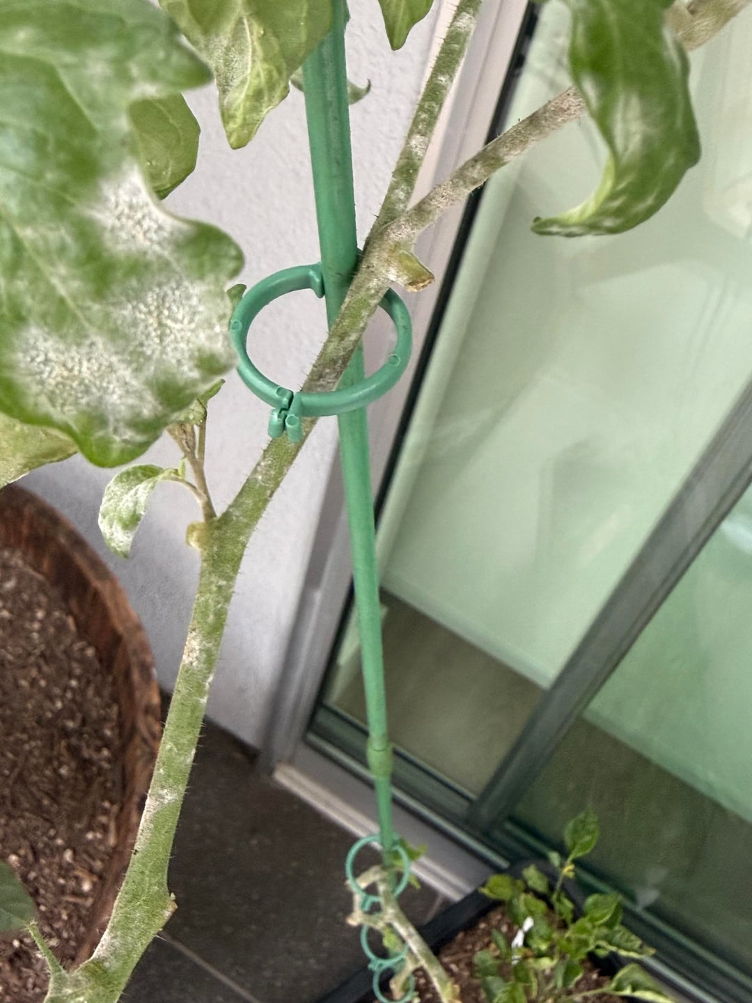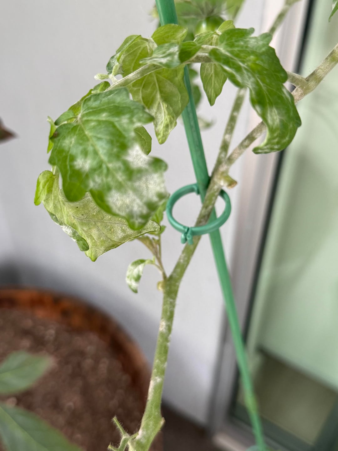 Hello, can anyone provide some advice on what’s going on with my potted cherry plant. It is planted alongside two pepper plants and has developed what looks like a white powdery coating.