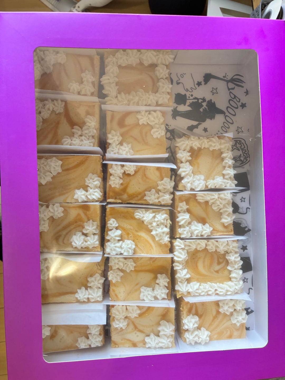 I made pumpkin swirl cheesecake bars as a treat for my tattoo artist’s shop