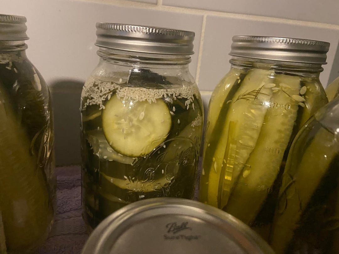 I left space in these cans. Should I toss them? Also I think there’s more water than vinegar on these ones.by Purple-Worldliness32 5 Comments Deppfan16 11 hours ago what recipe or process did you follow? Wild-Growth6805 11 hours ago What recipe? Purple-Worldliness32 11 hours ago Water 5 cups, 2 cups sugar, 1/4 cup pickling salt, 1 cup vinegar Purple-Worldliness32 11 hours ago I added sesame seeds, &dill Purple-Worldliness32 11 hours ago I’m worried I didn’t use enough vinegar and look at the other pictures, should I have filled it up more?