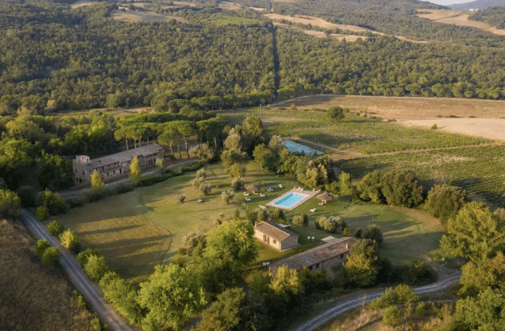 Located in the heart of Tuscany between Val di Cecina and Val di Cornia, the estate spans more than 1,000 hectares of untouched nature, vineyards and ancient trees. Its serene setting offers a peaceful escape from the bustle of everyday life and offers a place for renewal, scenic beauty and authentic local flavours.