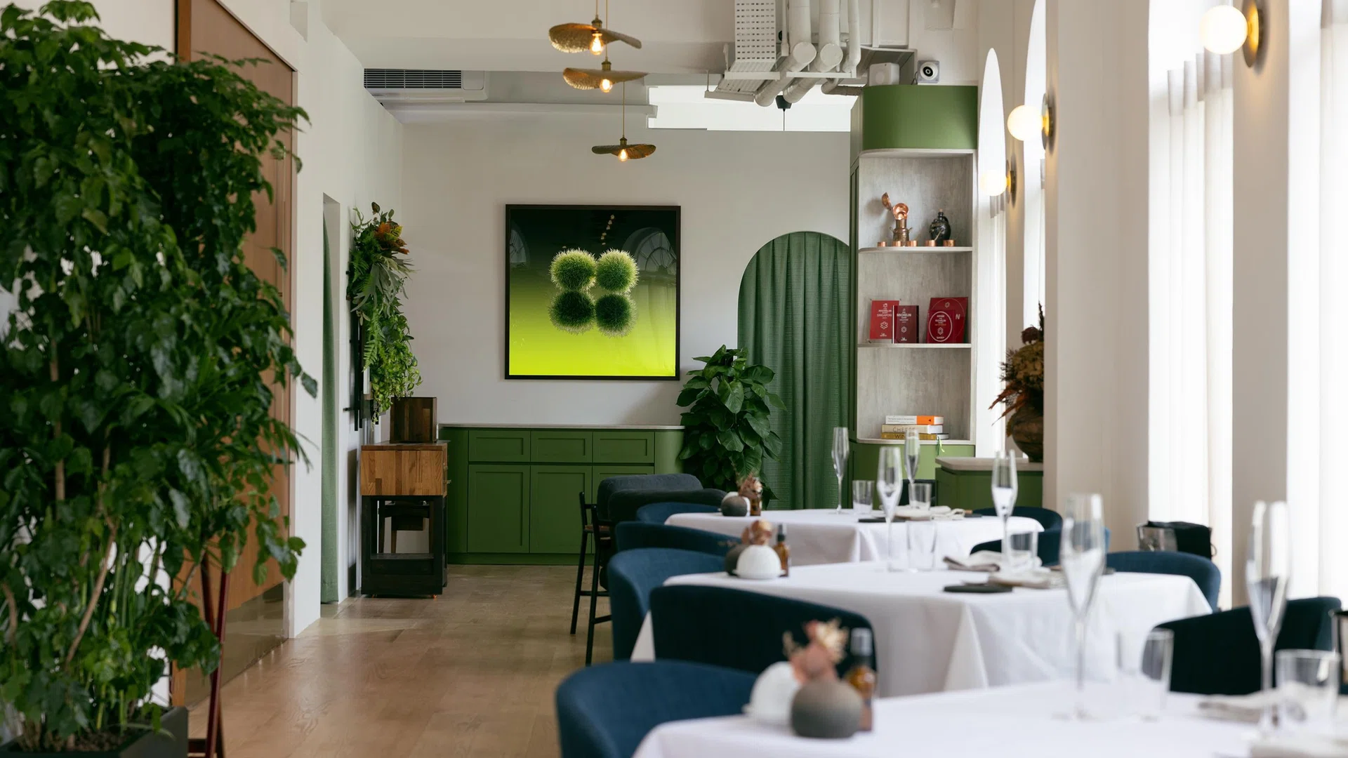 With Grandpa Celeriac mounted in the far corner and whimsical cabbages and carrots drawn on menu cards, Tan upholds the restaurant’s vegetable ethos like his own. Every meal begins with a showcase of bounty from France – perky specimens rolled in on a trolley, belying the distance they travelled or the carbon credits they burned.