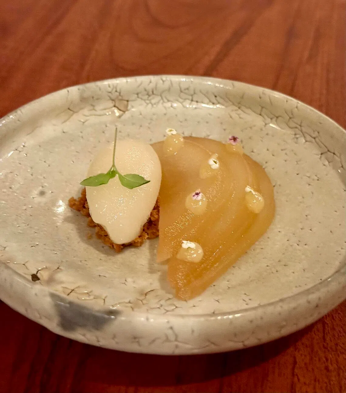What follows is less left-field. Fluffy, pull-apart bread dotted with black garlic paste. A warm-cold contrast of intense leek consomme under smooth, veloute-like potato cream – a smart take on conventional leek and potato soup.