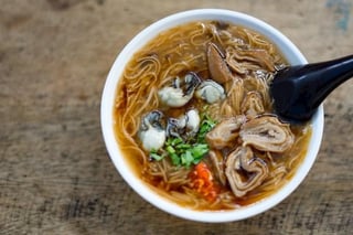 I'm pregnant and all of a sudden all I can think about is a piping hot bowl of traditional Taiwanese street food, misua goh or da chang mian xian 大腸麵線 with juicy oysters and thick slices of intestine, black vinegar, cilantro, and white pepper powder.