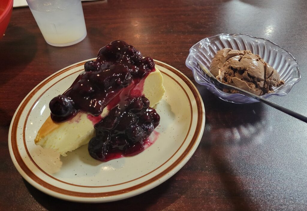 For dessert, I got a double treat. My dinner special came with a scoop of ice cream, I chose chocolate, and then I just had to order the homemade cheesecake topped with a generous helping of blueberries. It was just what I needed to cure the Monday blues and get me ready for the rest of the week.