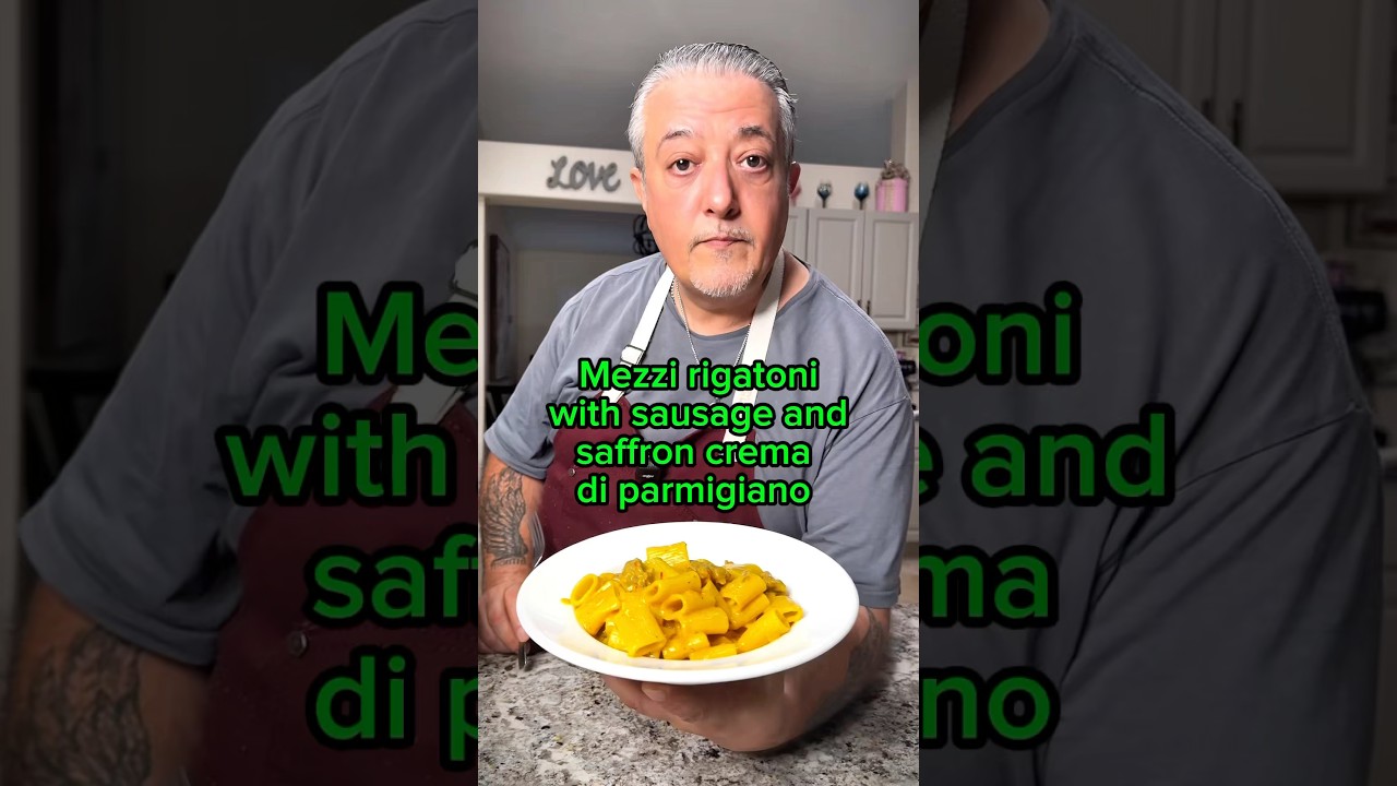 Meeratoni with sausage, crema de parmyo and saffron. The ingredients are all in here. One onion, granapadano, oparmigano, pepperonino, saffron, milk, sausage, extra virgin olive oil, vual bono, leaton, unjolio, chipola, salicha. We’ll leave here to cook for a few minutes. We’re going to need about two cups of grated parmyo deano boiling water which we’re going to use for our pasta. But in the meantime, we’re going to make a crema de parmyo. A little bit of milk, saffron. When it’s thickened up a little bit, you can set it aside. We put the pasta in. Little bit of pasta water. Little bit of pepper. Time to plate. Wow. What a petito.