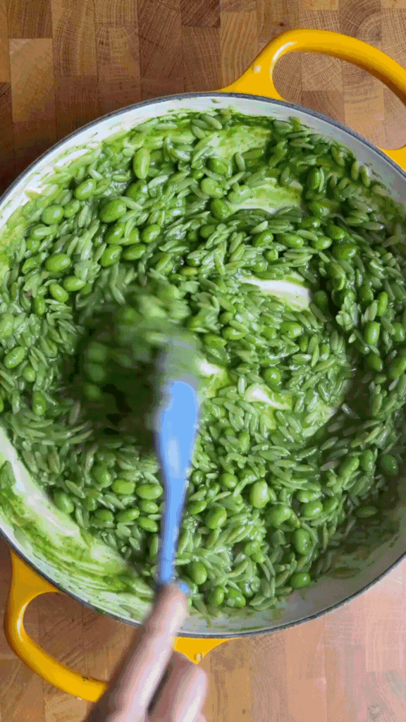 1. Turn the heat off the orzo pan, then pour the edamame into the cooked orzo, then the kale miso sauce and stir well. Gently fold in the tahini and chopped roasted broccoli, season to taste, then serve into bowls and top with lemon zest and a little more runny tahini.