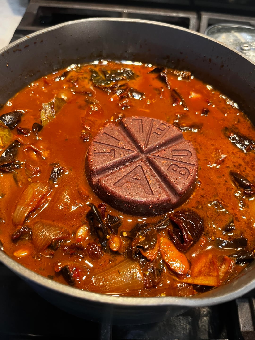Not sure how traditional it was, but used dried Pasilla, ancho, and chipotle chiles, onions, pumpkin seeds, raisins, several spices, and chocolate.