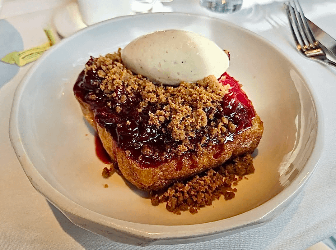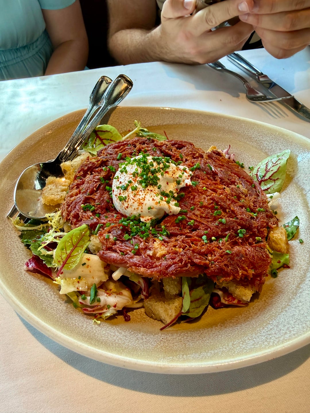 Food: Waiter shared a copy of the specials on the menu, but only 2 of the 4 were available, a bit disappointed that half the items were already sold out. Picked out one of the daily specials: Chai and Espresso Pastry (yum), shared the Salad Lyonnaise Canard (crowd favorite by far, duck was fantastic), and had mains including: French Toast with berry compote and mascarpone cream (very solid), Lamb Neck Poutine (a nice twist on a classic), and Quiche (extremely light, maybe steamed?). Overall the food was 9/10.