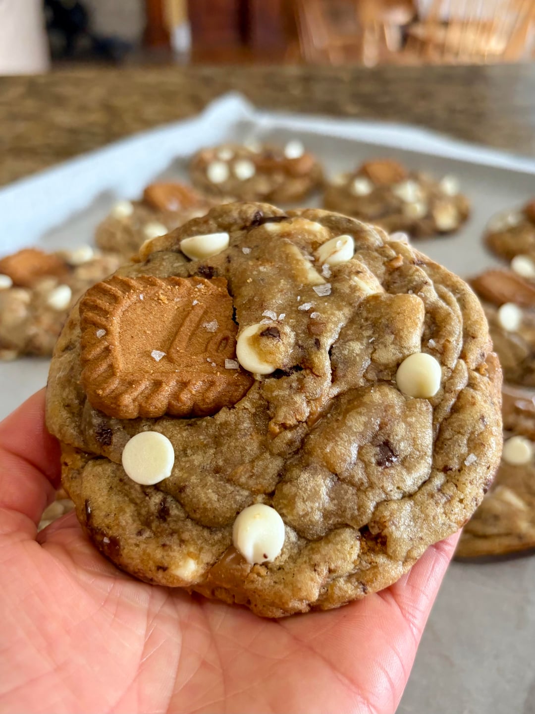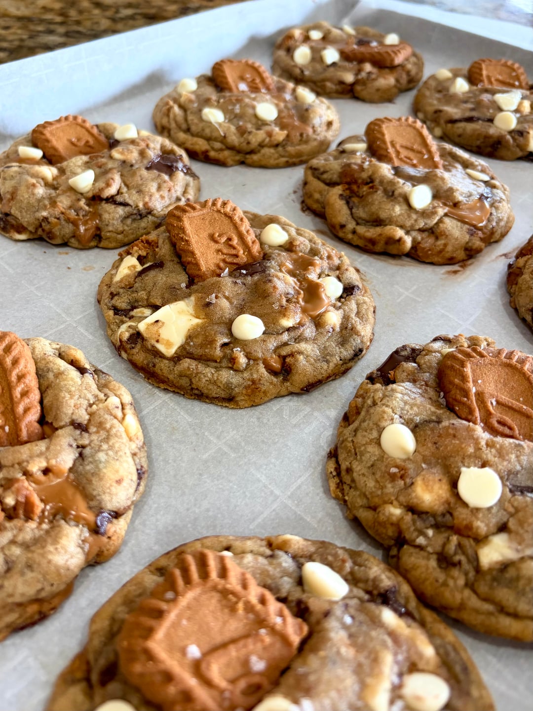 sally’s chewy chocolate chip cookie recipe as a base, threw in some white chocolate chips and chunks, stuffed them with 1tbsp of cookie butter 😀