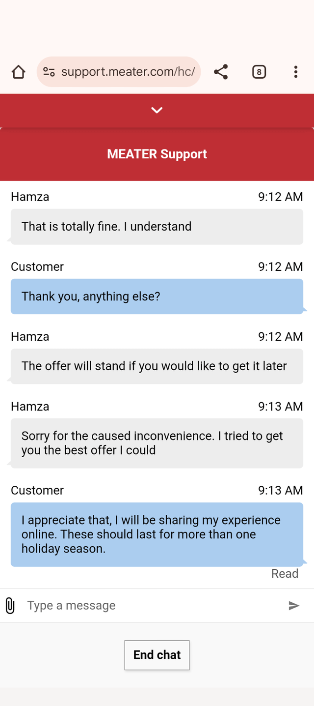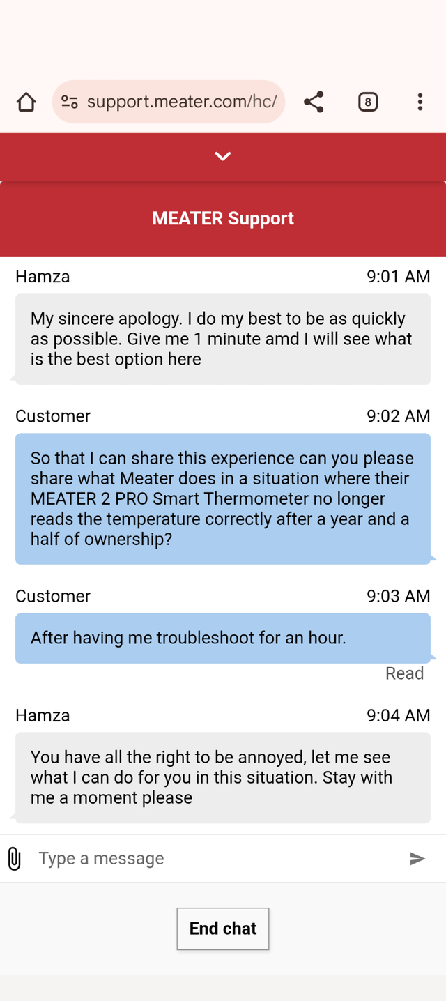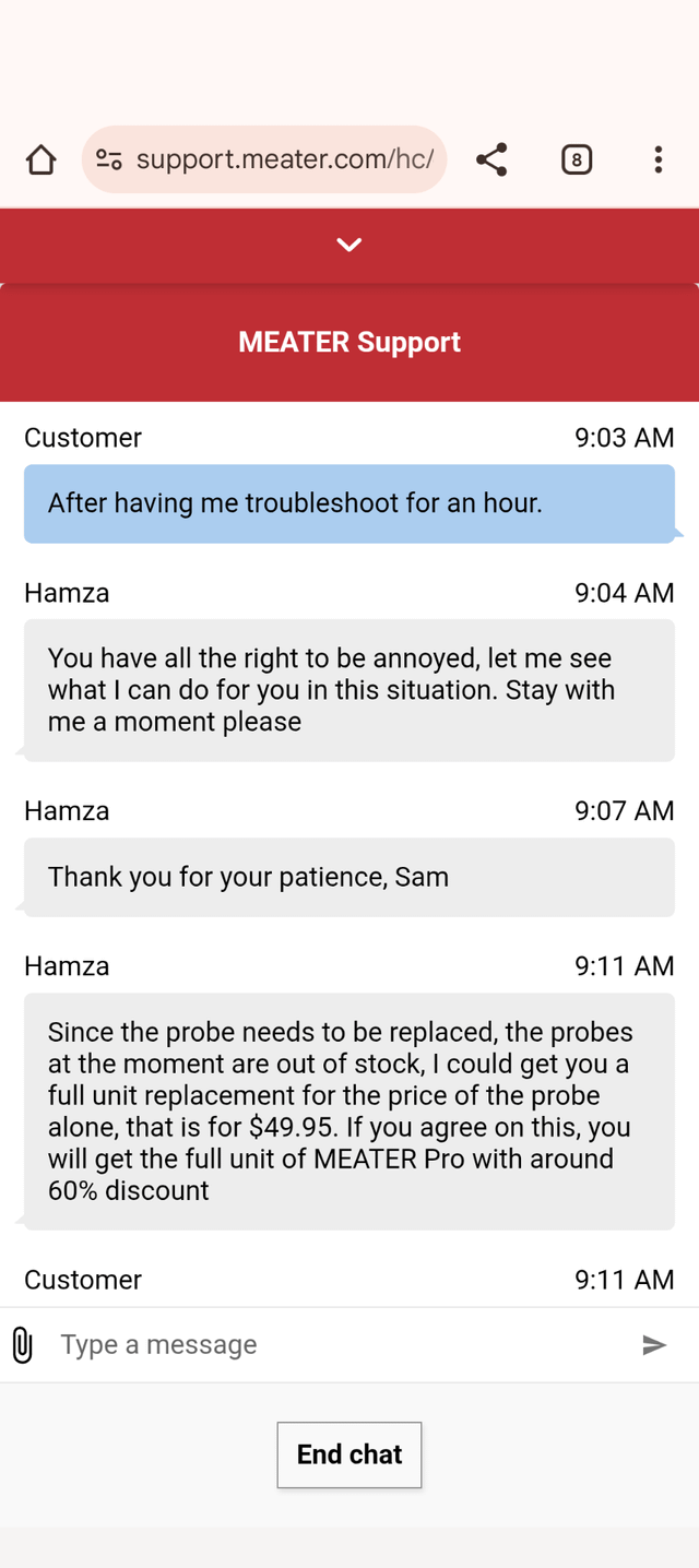 I reached out to MEATER support for help and they had me trouble shoot for about an hour, submerging the probe in an ice bath, taking and uploading pictures. After all that they were generous enough to offer me a 60% discount on a new one!