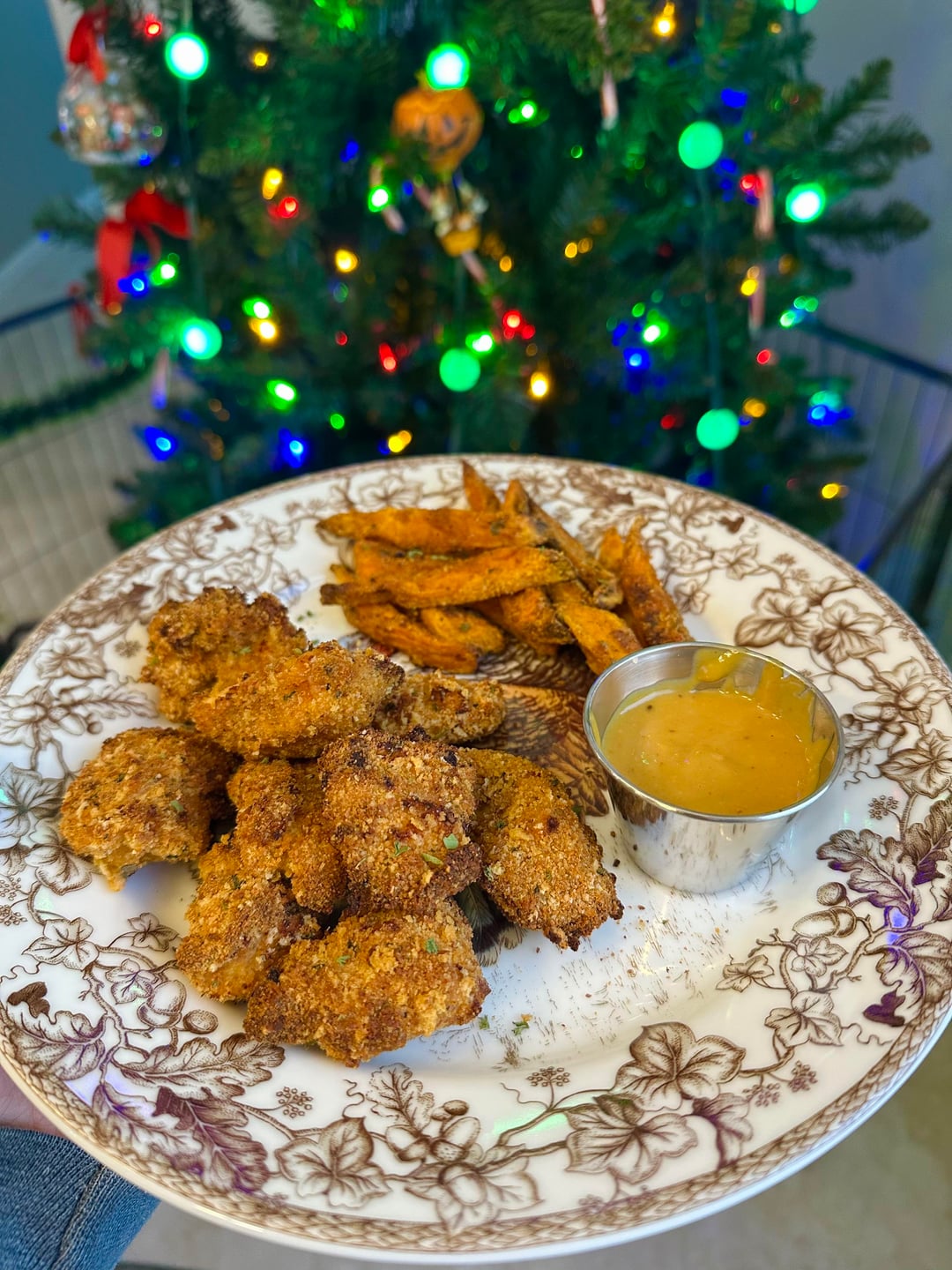 Fifth photo (featuring christmas tree- gated because of crazy puppy!) is baked chicken nuggets, sweet potato fries, and CFA Sauce. Really good, and less messy than frying.