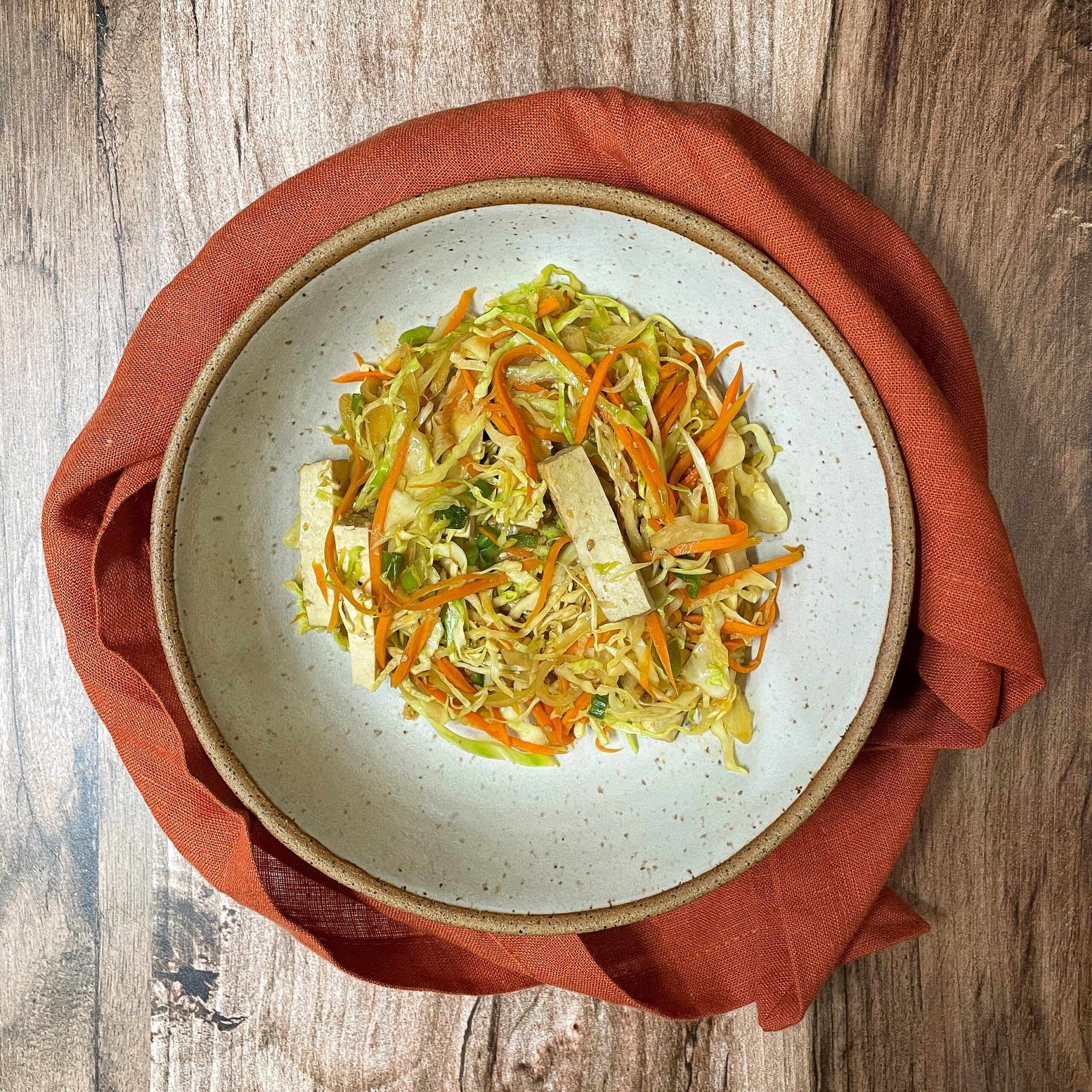 There are tons of recipes out there but I just threw this together. Lots of shredded cabbage, carrots, onions, scallions, a couple of leftover mushrooms and sesame ginger baked tofu for protein. Sauce was soy sauce, rice vinegar, a small amount of sesame oil, homemade chili oil, toasted sesame seeds, grated ginger and garlic—all basically to taste. All mixed together and stir fried briefly so the veg was still crispy/crunchy. Lastly, I threw in a few wonton crisps. Totally optional but I like the extra crunch. Very tasty and easy to throw together with whatever veg you’ve got on hand.