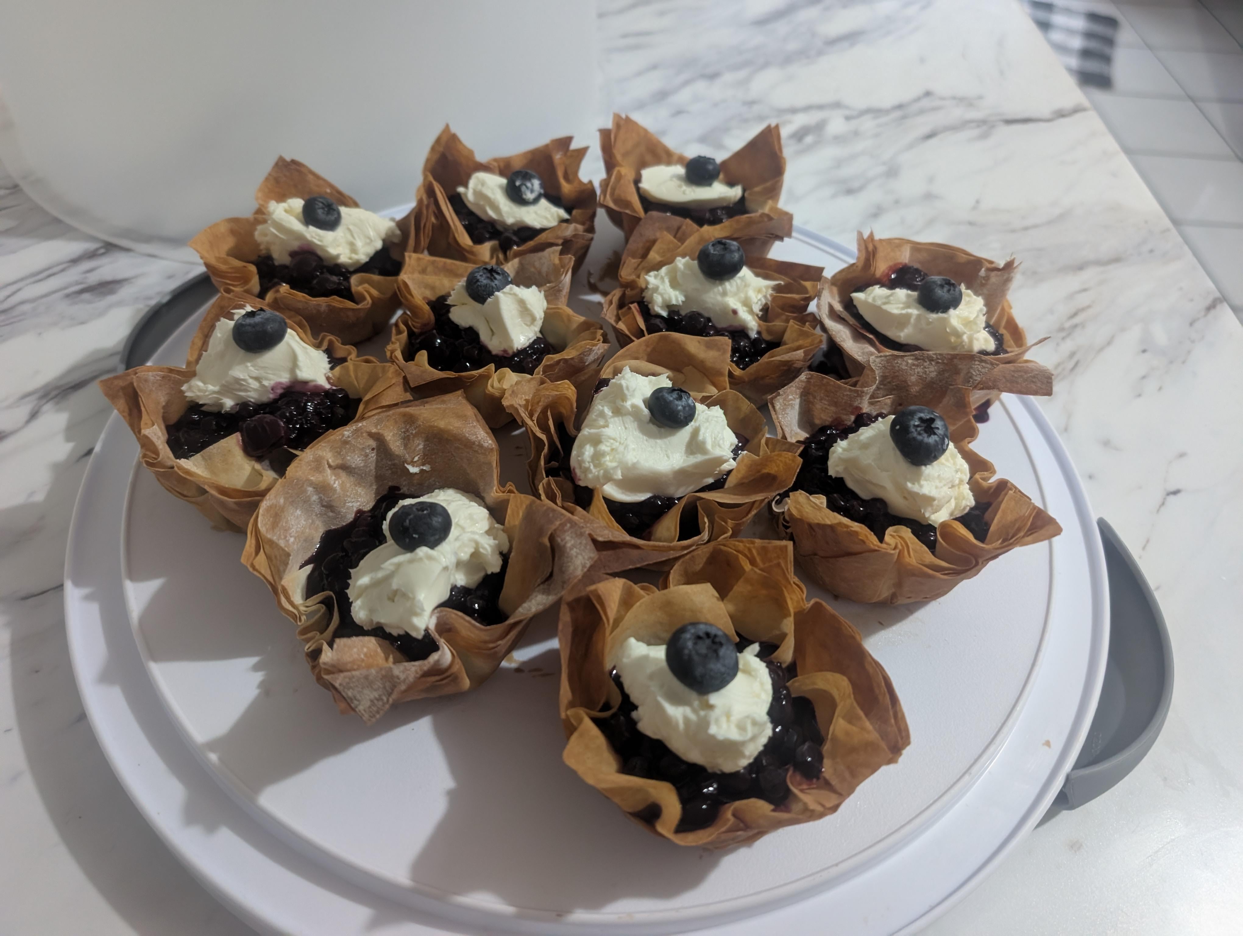 I had some phyllo dough left from my diner so I made a compote with the blueberries and a bit of sugar and whipped some cream cheese with lemon juice to top it. by Izdunord Dining and Cooking