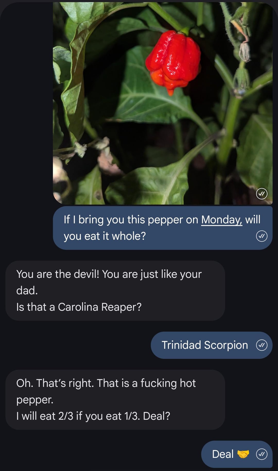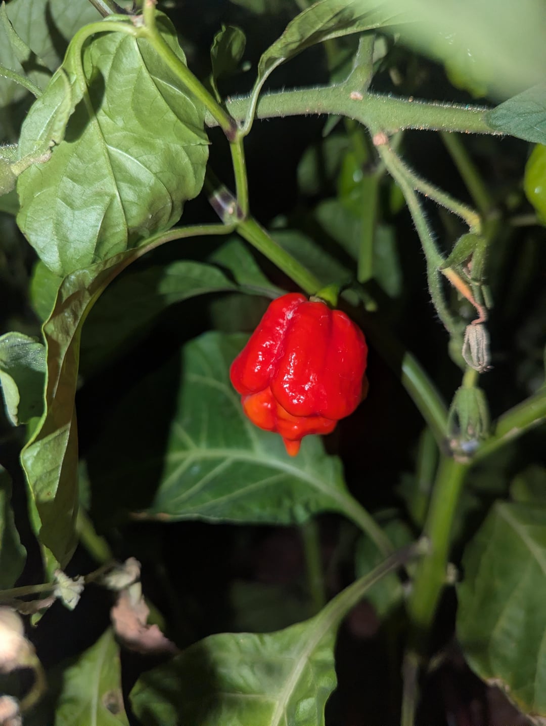 Several months ago, I saw some Scorpion Pepper seedlings on clearance, so I scooped them up with him in mind. One finally produced a ripe pepper, so I sent him a text joking that he eat it. He responded back that he would eat 2/3rds if I ate 1/3.