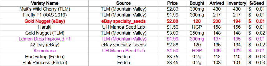 My current king of the hill is Matt's Wild Cherry from True Leaf Market, $2.89 for 300mg. Their website said 65 seeds, but they actually sent 430 lol. It took a while to count them!