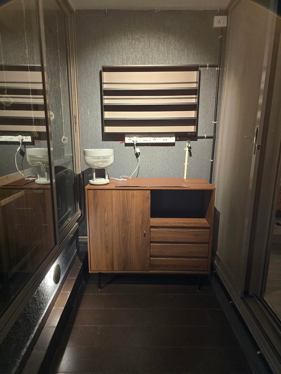 This space houses a espresso machine, coffee grinder, waste bin, portable fridge, pitcher rinser, fan and coffee accessories. Most of the furniture is from Ikea and fan is from MUJI.