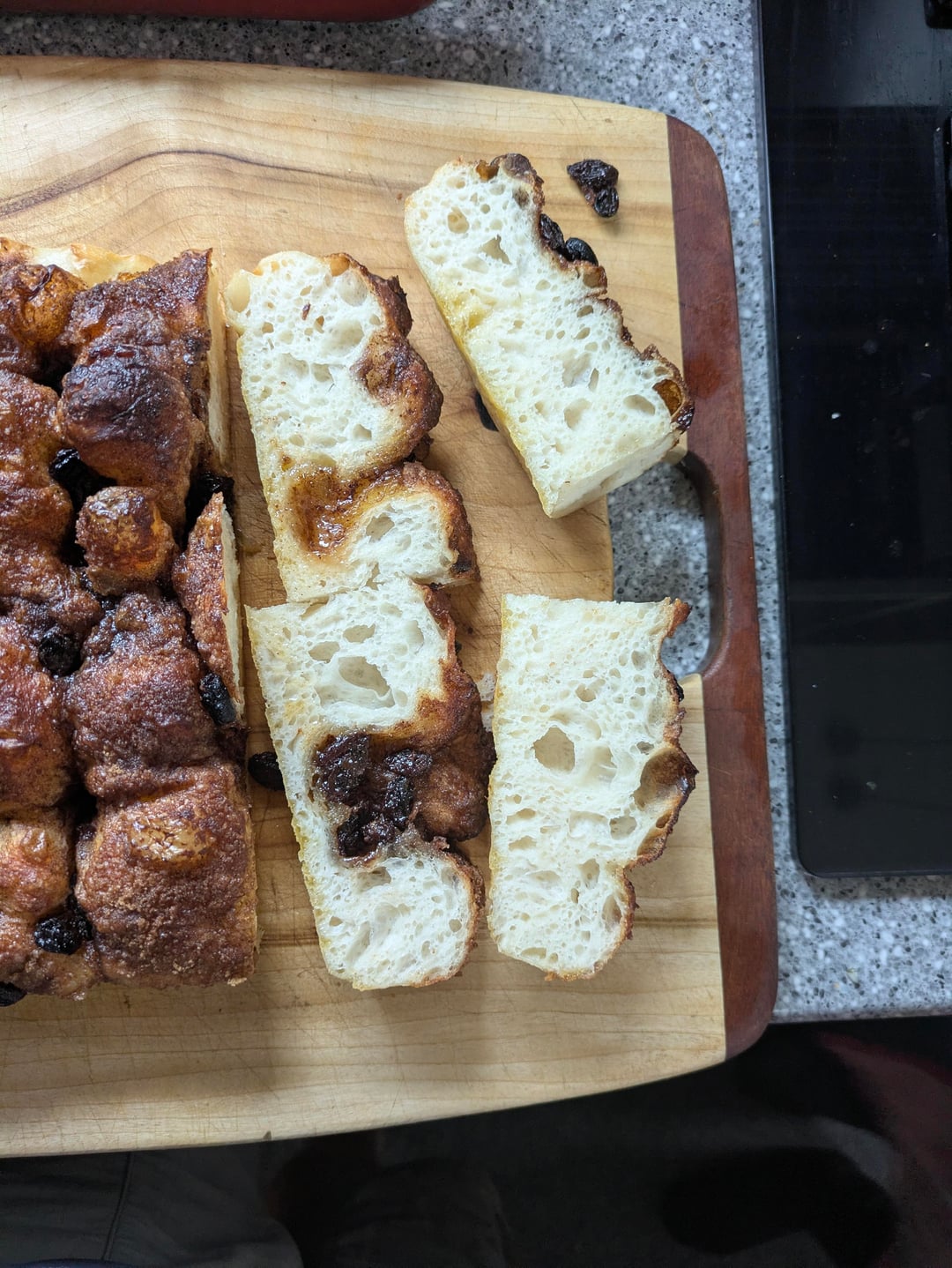 91% hydration, 1% salt, 1tsp yeast. Melted butter underneath rather than oil. Topped with a sultana, brown sugar, cinnamon and nutmeg mix (about 1/2 cup plus 1/2 cup sultanas). Poured over a 1/4 cup or so of melted butter, did the finger push thing and baked. OMG, delicious doesn't cover it…