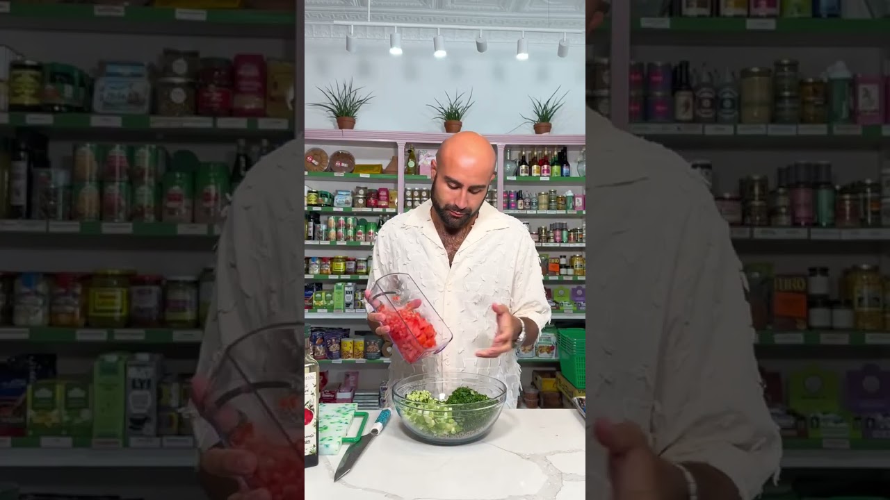 When I was in Lebanon this summer, I had this delicious quinoa tabuli salad at Indira up in the mountains and I honestly fell in love with it. I’m not a big quinoa guy and I was like, you know what, this is so good because I also don’t like which is normally in a tibuli. So, here we are making it today. In a big bowl, I’m going to dump my cooked quinoa and then some chopped parsley. I have about four bunches here. And then some chopped up scallions, cucumber, and my chopped tomatoes that I chopped for you live with my new toy. Now, let’s make our dressing. I’m going to grab a bowl and zest three lemons. Then juice our lemons, some extra virgin olive oil, some salt, and some pomegranate molasses. Every tibuli nowadays has pomegranate molasses in it, which makes it so much better, too. We’re going to mix that all together. And we’re going to drizzle the dressing over the quinoa tibuli. And mix that all together. And then we’re going to plate it the old school way in a clay bowl with some lettuce leaves around. Now, let’s dig in. Cheers.