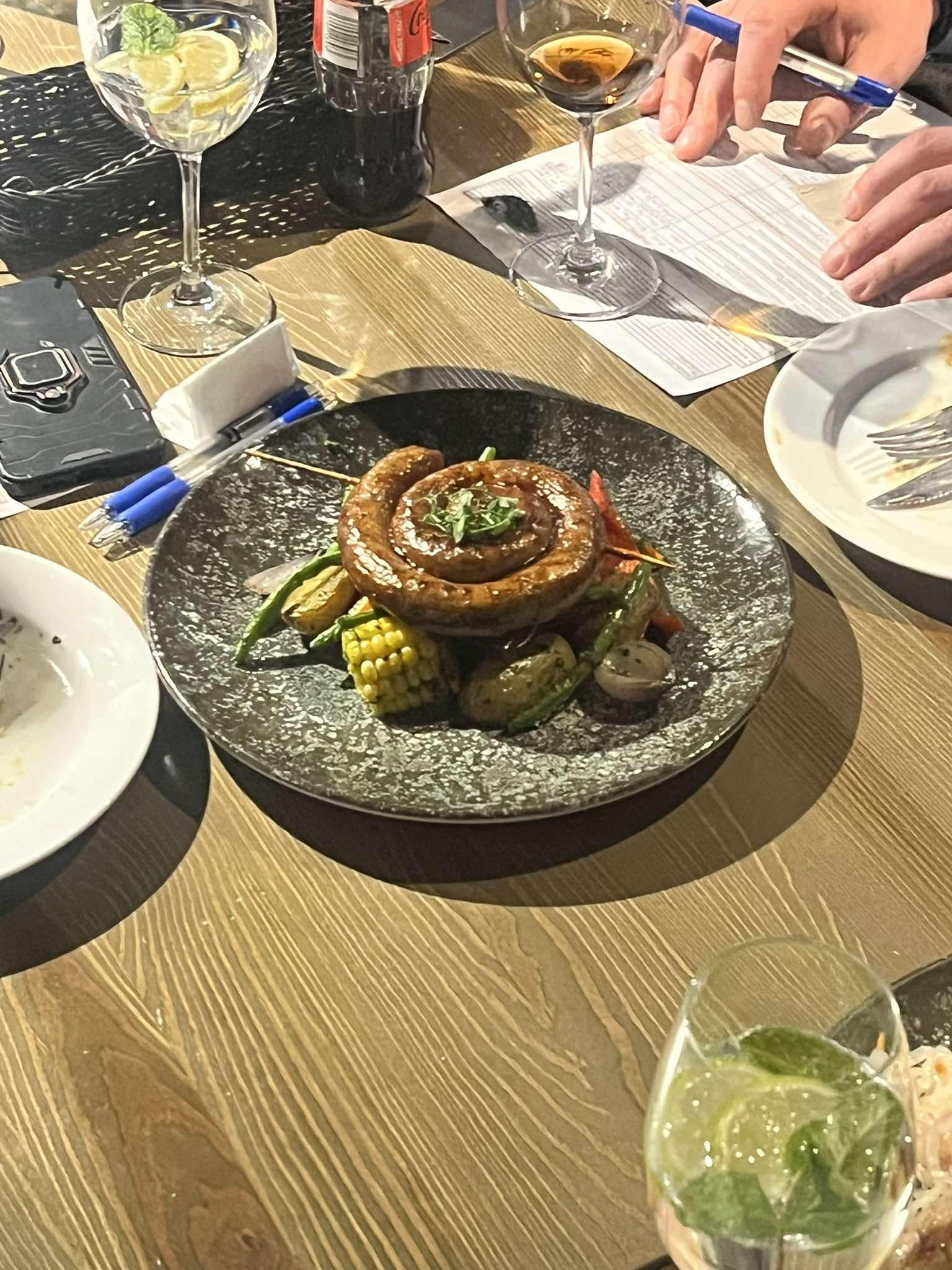 difficult to eat. you basically have to rearrange the food before you can start cutting into the sausage thats on top. and such a small piece of corn but still on the cob? do you get your fork stuck in it to bite the corn off and then have to awkwardly pull it off again?