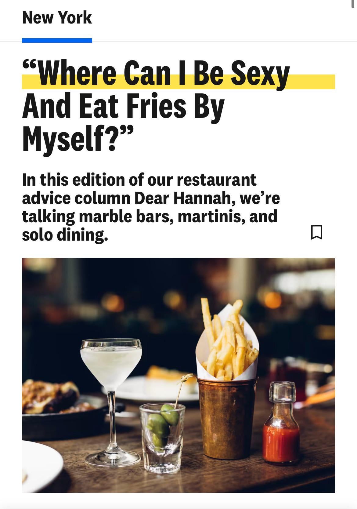 Same as the letter writer, I love dressing up, going out solo, chatting with strangers and seeing where the night goes. I have my own personal spots but I want to know everyone else’s 🙂 by RougeChaotique Dining and Cooking