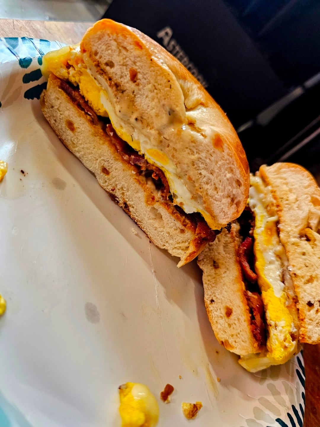 Quick B/E/C Bagel 😁 while cooking the bacon and toasting a bagel mix some mayo, pickle juice, lemon juice, worcestershire sauce, dijon mustard, dill, onion powder, garlic powder, paprika, and pepper…I don't bother adding salt since bacon is already salty…mix it up and adjust to taste. By now, the bacon should be crispy and the bagel toasted, spread your sauce, add the bacon, then fry a couple eggs in the bacon fat. Add a slice of cheese and enjoy!