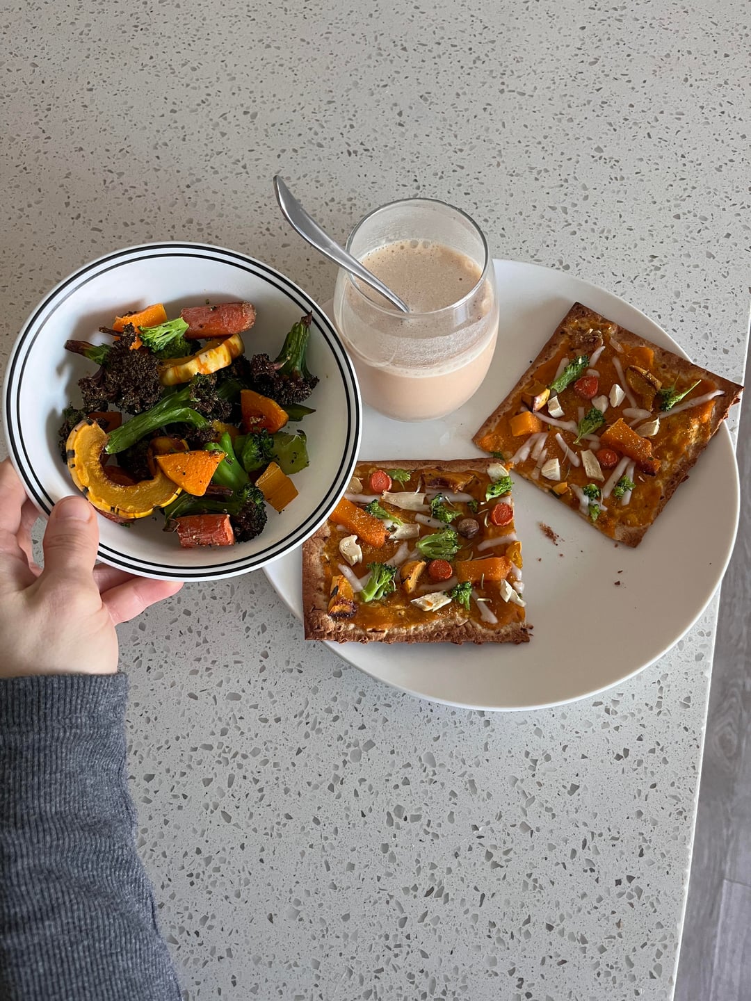 • Pumpkin & butternut squash pizza on half of the Trader Joe’s Lavash bread with cashew mozzarella shreds and toppings+side bowl of broccoli, carrots, garlic, and delicatta squash. And, ofc, my pea protein drink