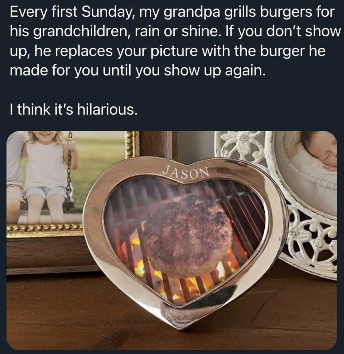 Just for Laughs by Limp_Sheepherder69 6 Comments StevenG2757 3 hours ago This made me smile. Thanks, jetcamper 3 hours ago Fair EddyGurge 3 hours ago At first I thought you were cooking a burger patty over a heart-shaped tin can EveryValuable1503 2 hours ago Does he cook a good burger? pyro_pugilist 2 hours ago That burger looks pretty good! I treesmith1 2 hours ago Anyone would be lucky to have a grandfather like this. Props to the elder.