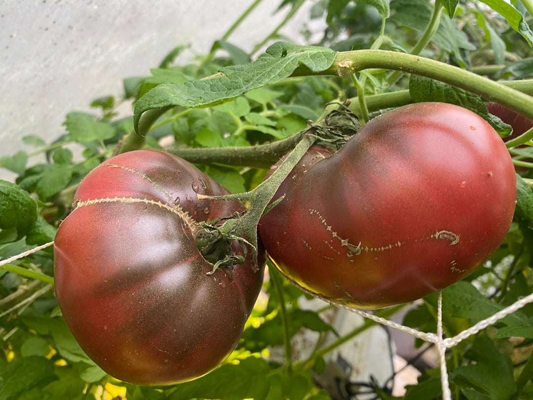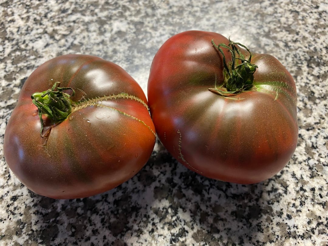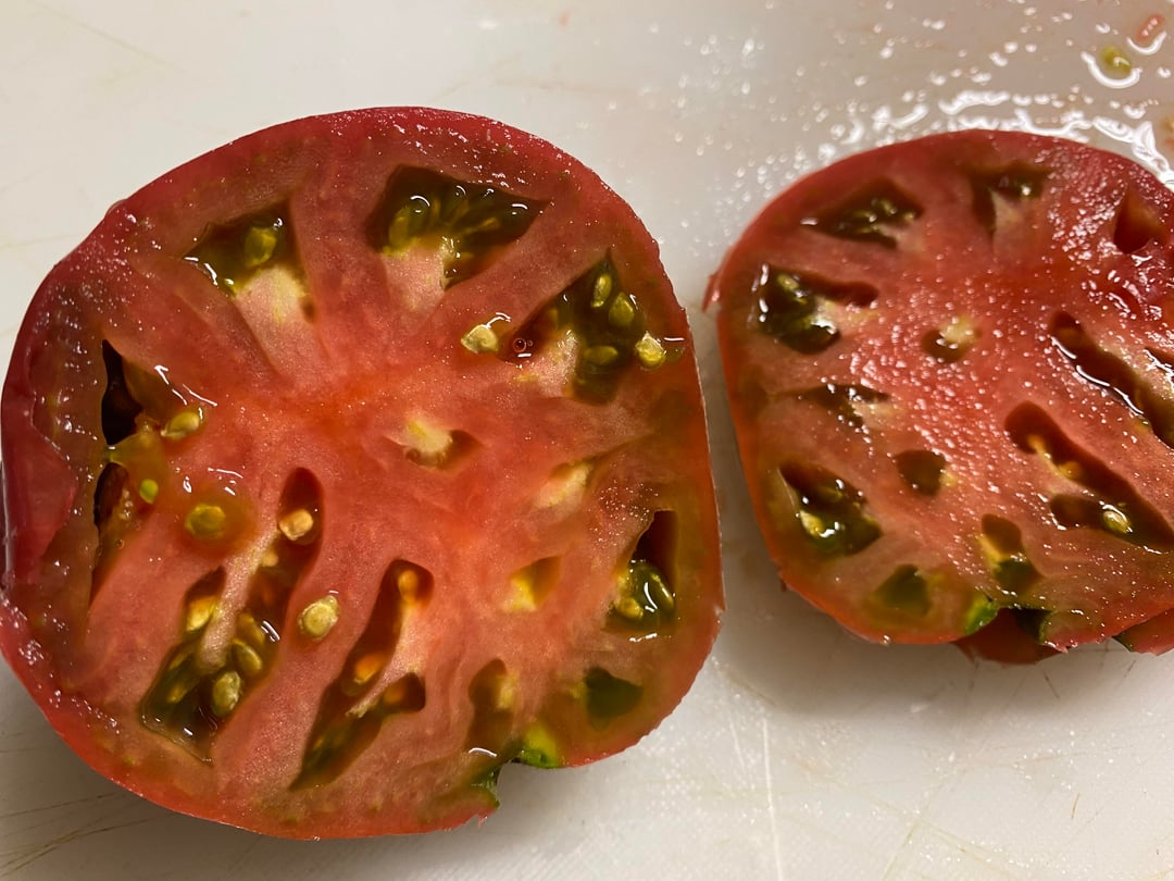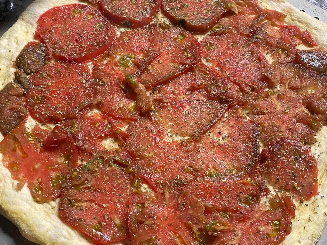 I thinly sliced two Cherokee Purples, sprinkled home grown oregano and a tad of garlic powder and salt. Some of the best pizza "sauce" I've ever had!