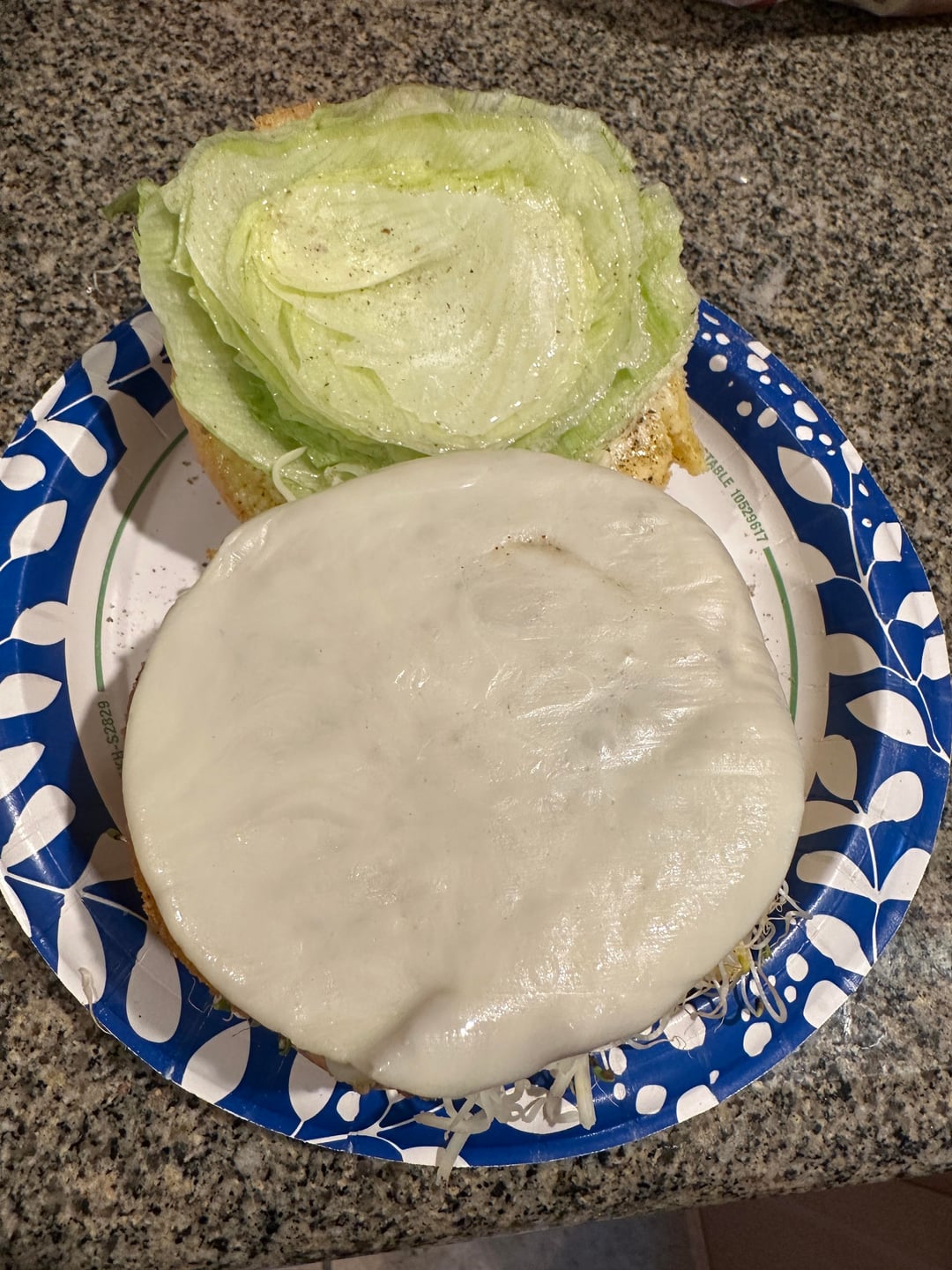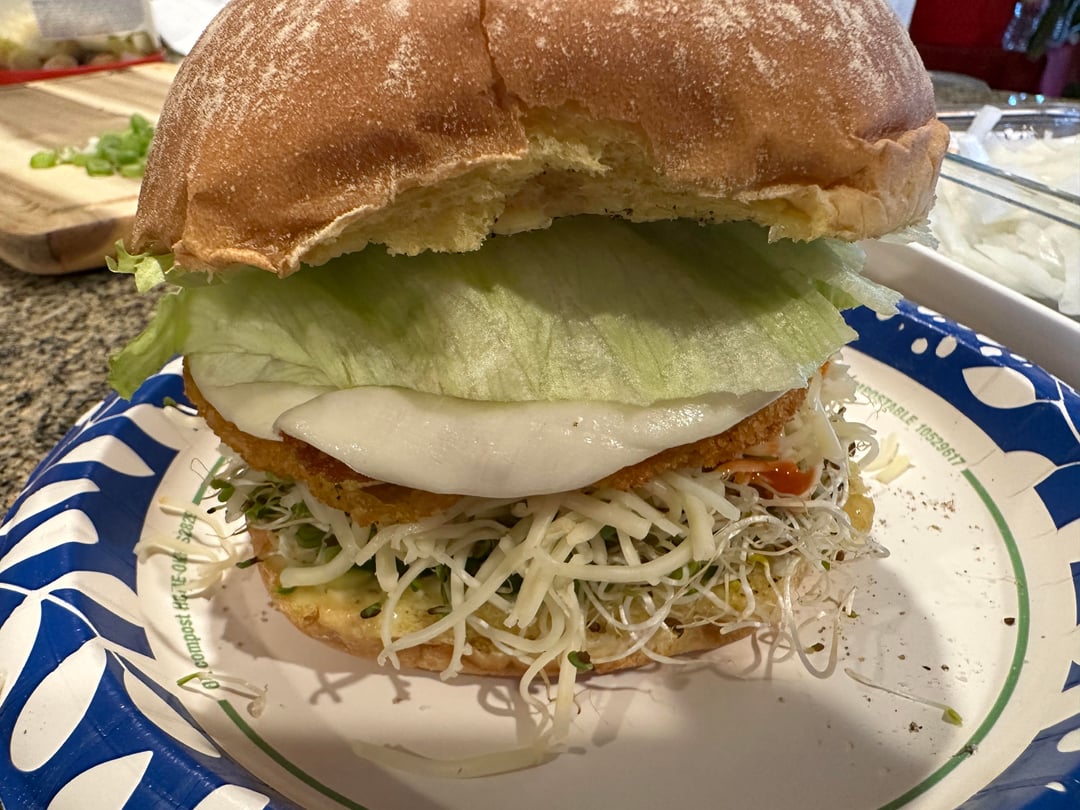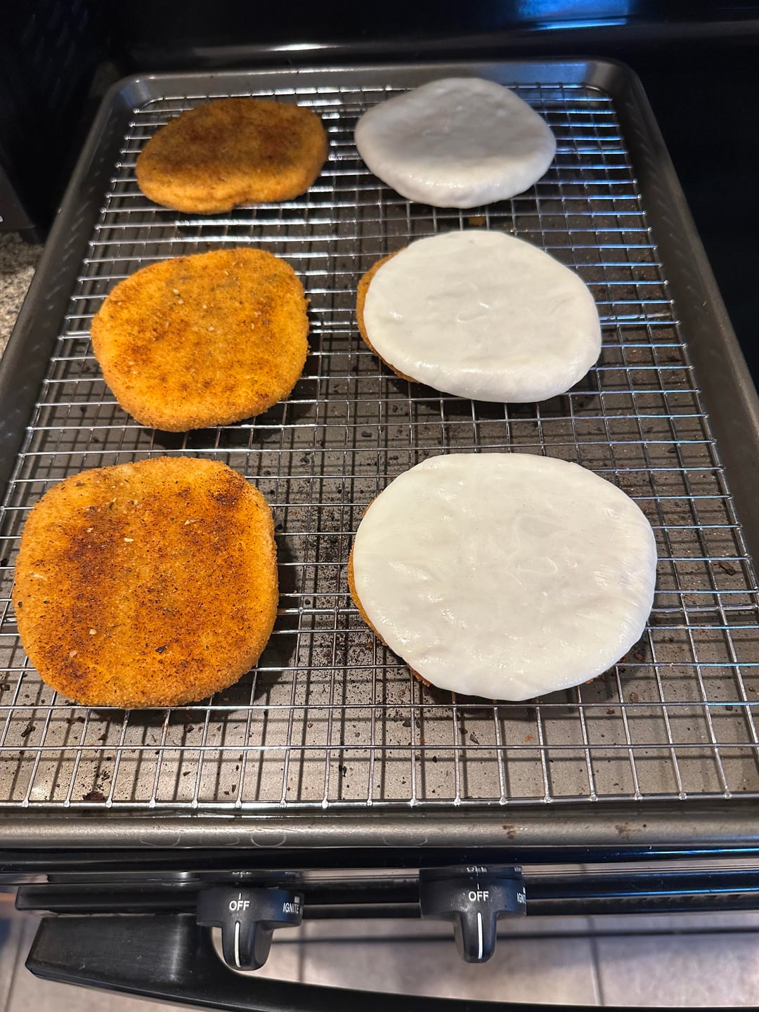 My local grocery sells fresh breaded ground chicken patties. I seasoned them and baked them in the oven. The sliced cheese is provolone and the shredded cheese is pepper jack.