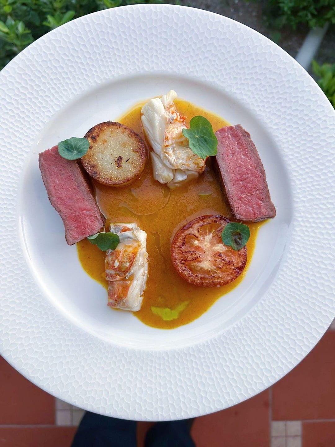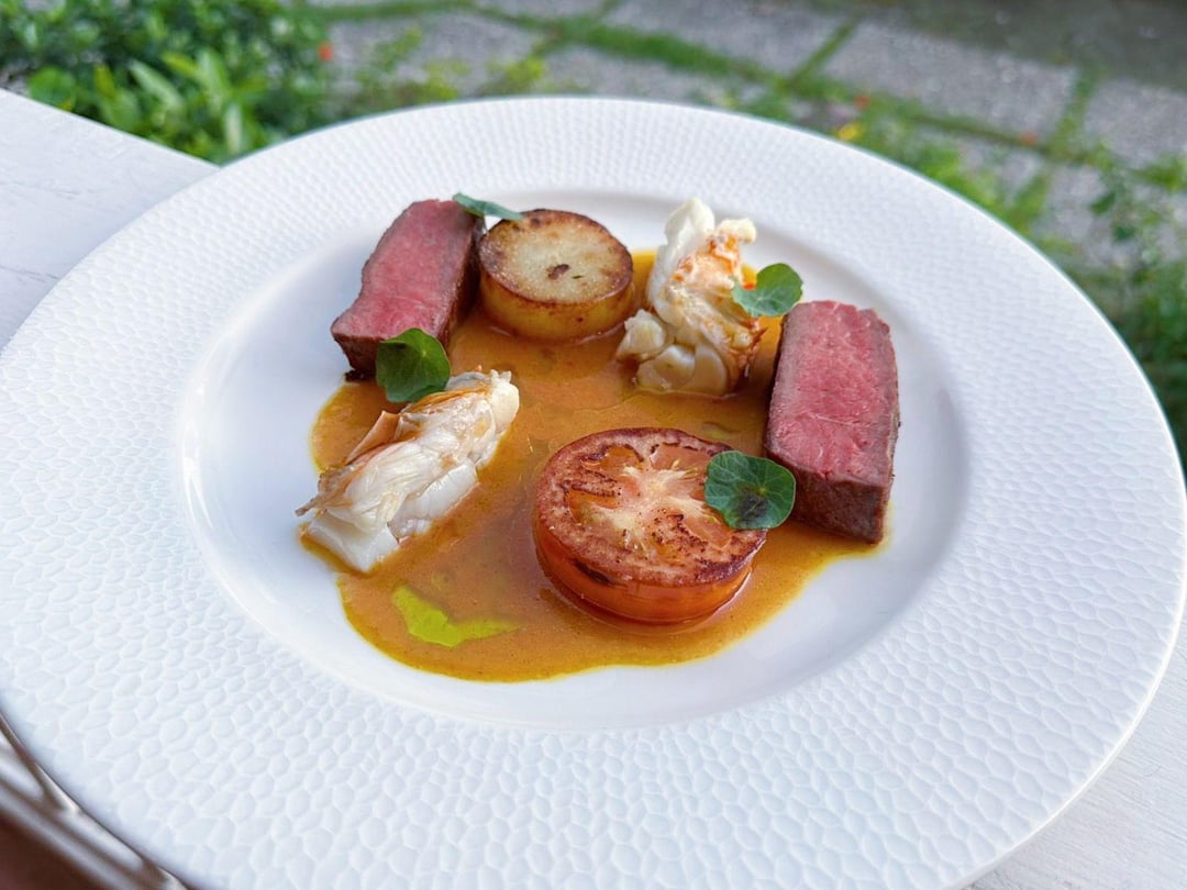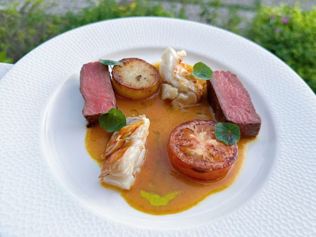 Surf and Turf- Lobster Butter Poached Spiny Lobster, Striploin, Potato Fondant, Roasted Roma Tomato, Vadouvan Beurre Monte.