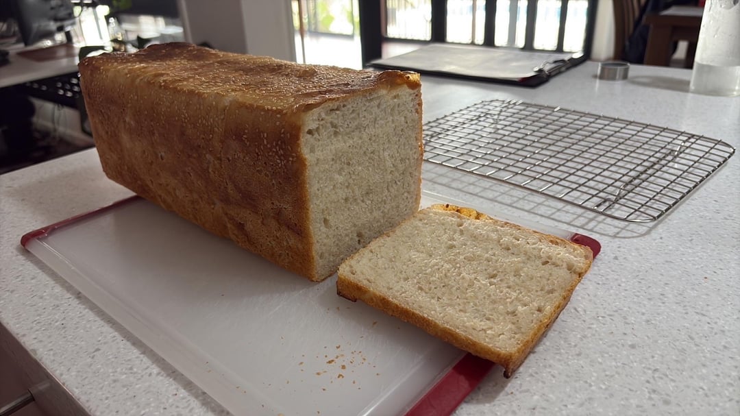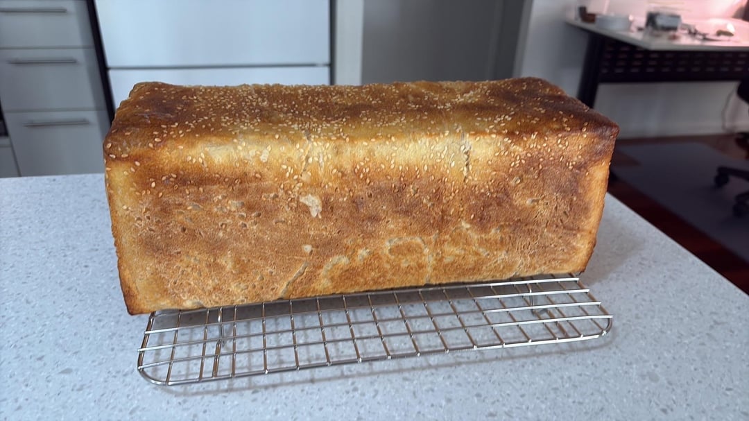 Just made this DOPE white block loaf in a Amazon 1kg /“2 pound” Pullman loaf tin (the big one). The key was putting in significant amount more of starter to handle the rise. Didn’t write enough notes 🤦♂️ but here is the rough ratios I used: White bread flour approx 800g, wholewheat flour approx 100g, tepid water approx 700g, 250g active starter 💪, 20g salt. No enrichments. First I combined the ingredients to shaggy state in a giant stainless steel bowl (i like to stir with a stainless steel chopstick ) (thanks for the tip mum! 🤙), cover waited 15mins, 3-4 stretch and folds on counter – very sticky used a dough scraper to flip/ stack the dough onto itself with 20min breaks. Then broke off a small piece of dough and inserted to glass shot glass to use as monitoring station/yard stick. The I bulk fermented to only +50%. That I think was key too. One more counter stretch/flip and fold then in the pullman tin for a final rise. Oh yeah handylife hack: brush oil inside pan then cut baking paper (aka parchment paper) liner to size , oil sticks it really well to the tin. So then final rise was on counter till half way up the pullman pan (only) (was very active..warm here ..only took 2 hours – kitchen temp about 33 degrees C), sprinkle of sesame seeds on top, overnight in fridge. Following morning it had risen to 85% of tin height from the 50%. Then I left on counter an hour and kept monitoring shot glass (which had also gone in fridge), as it increased size again +5% then I fired up my piece of 💩oven to full-wack (~220C realworld) 30 mins later in it went, baked it lid on for 30mins, lid off for 5mins, then took out of tin and gave it 5 more minutes commando style. Inside crumb looks like commercial/normie white bread but its beautiful sourdough with epic taste, crust and texture 😍🤤