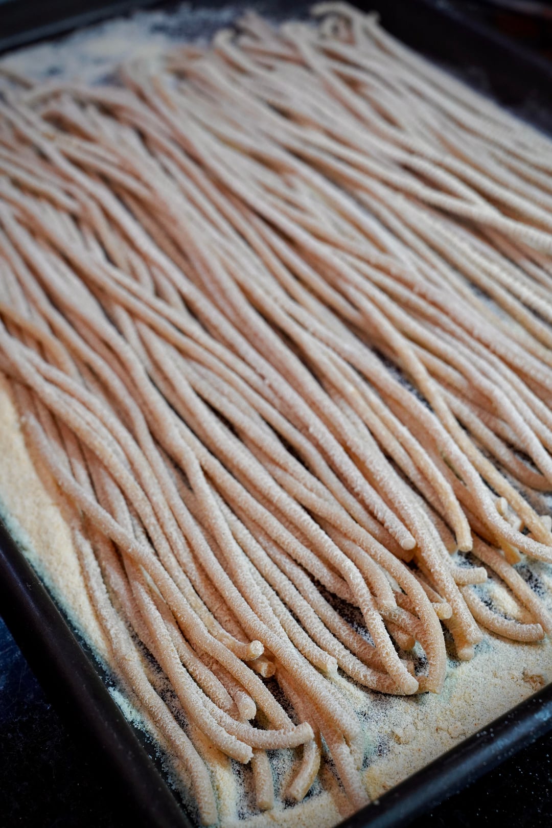 I didn’t want to make Pici so I instead extruded some Bigoli with 1/6 chestnut flour since the recipe reminded me of Venice.