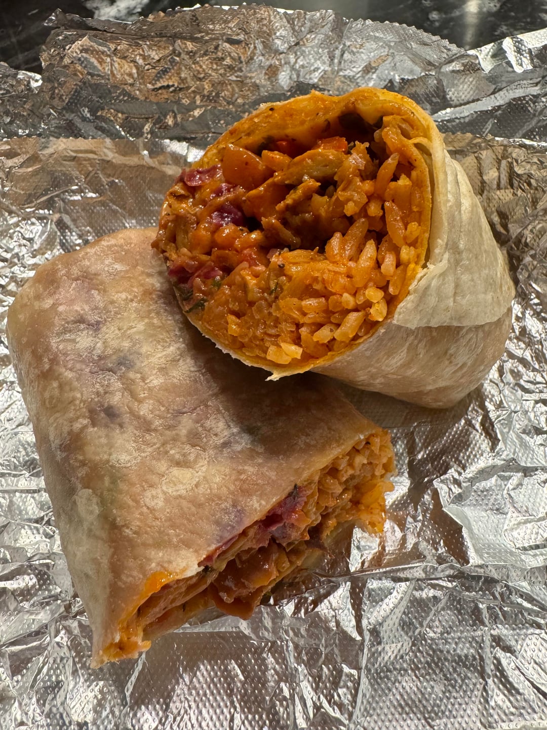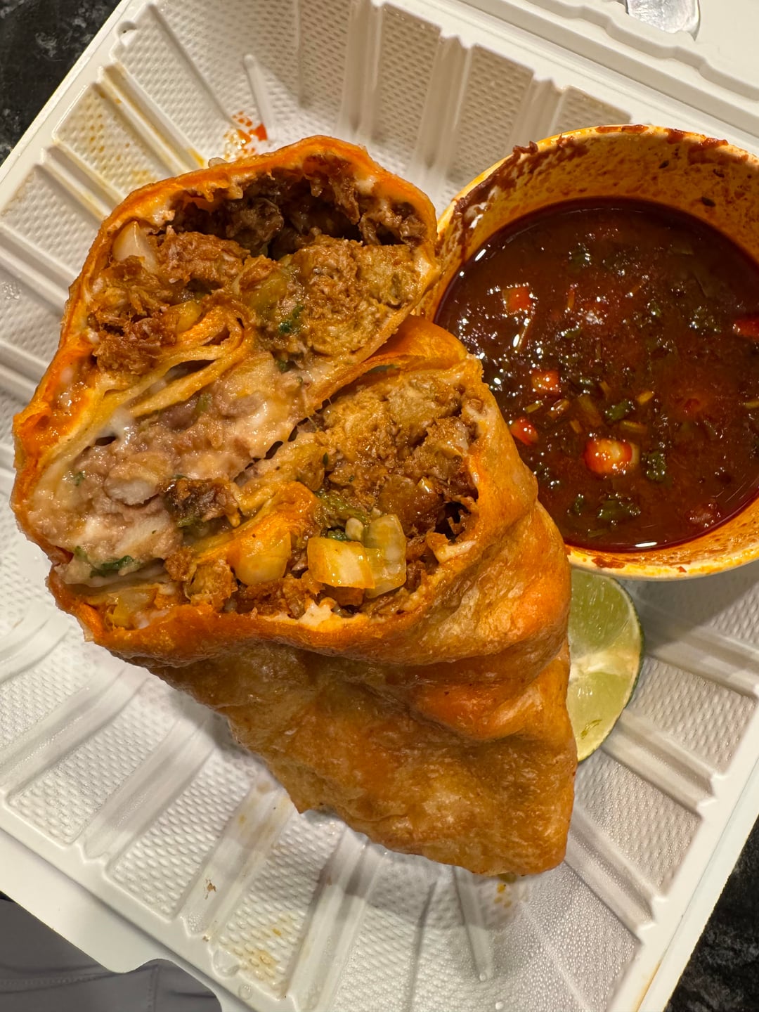 BBQ Chick’n Burrito and Quesabirria Burrito. The first burrito obviously isn’t a traditional burrito but it is so damn good. And the vegan consomé is on point for dipping the Quesabirria.