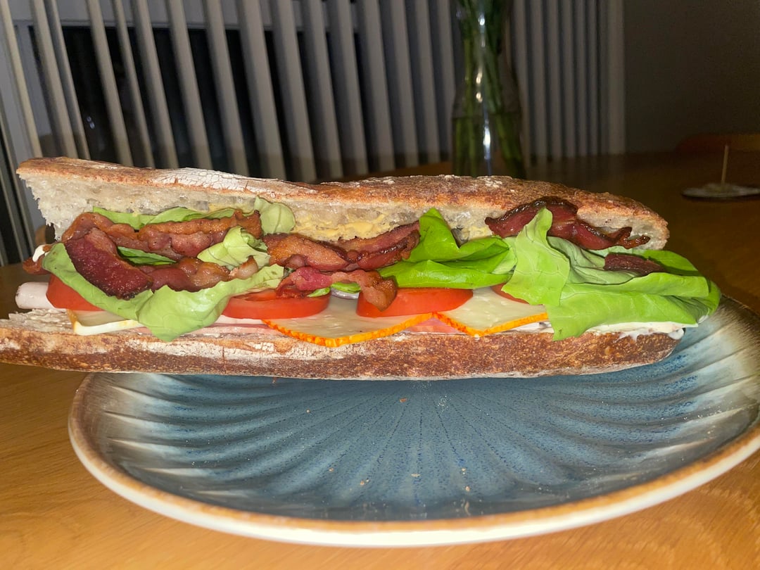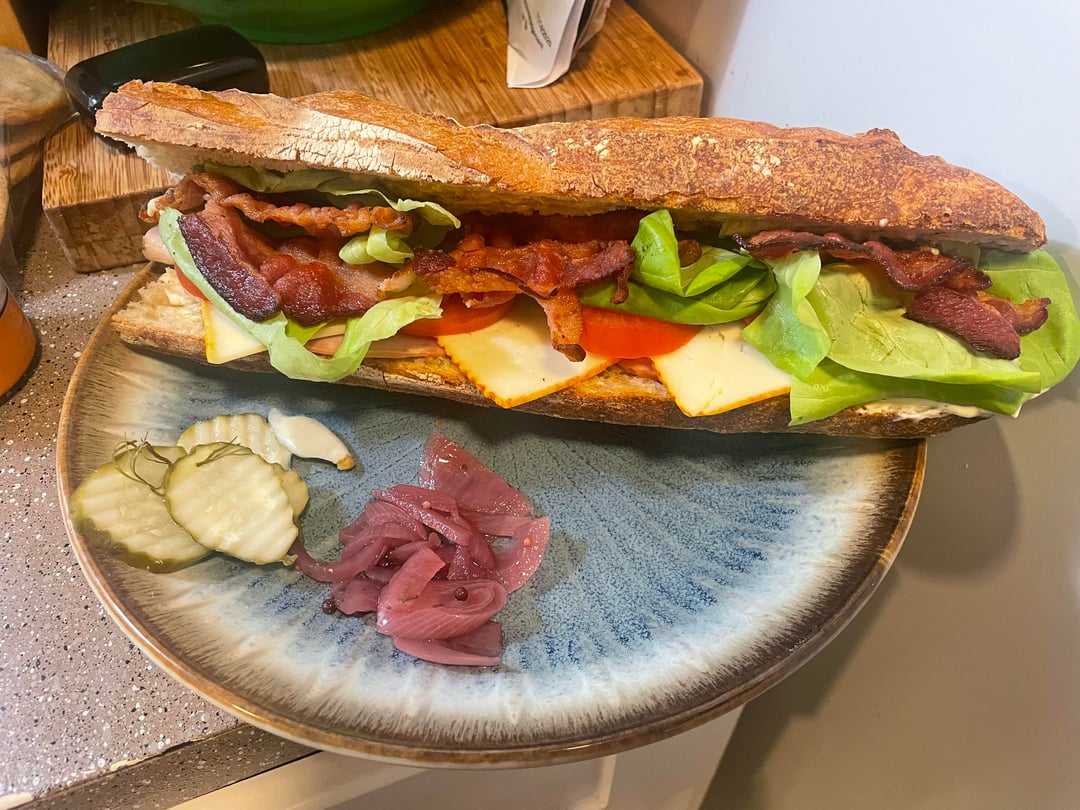 Scoop out the bread guts and fill that area with chopped lettuce mixed with mayo red wine vinegar and olive oil, then add like double the bacon. Wrap in parchment and cut into 3 pieces
