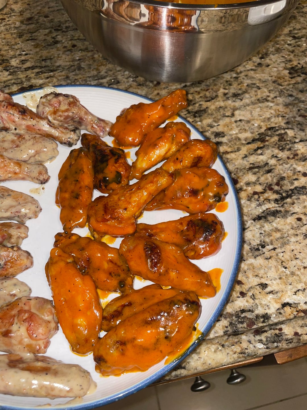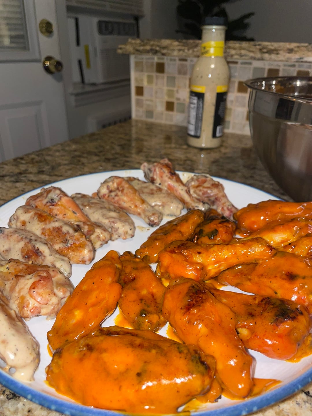 Sometimes you just need to find a helpful comment from 11 years ago to get your sauce to stick better! Home made buffalo & BWW garlic parm. (Oven baked then grilled)