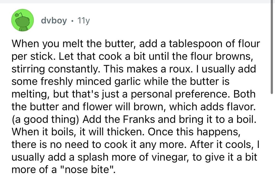I feel like I have seen this comment. And a guy responds to it and says fuck all that, just add mustard to the buffalo sauce as it is a natural emulsifier. Ever since I saw that years ago, I just add French’s yellow mustard, it works fantastic!