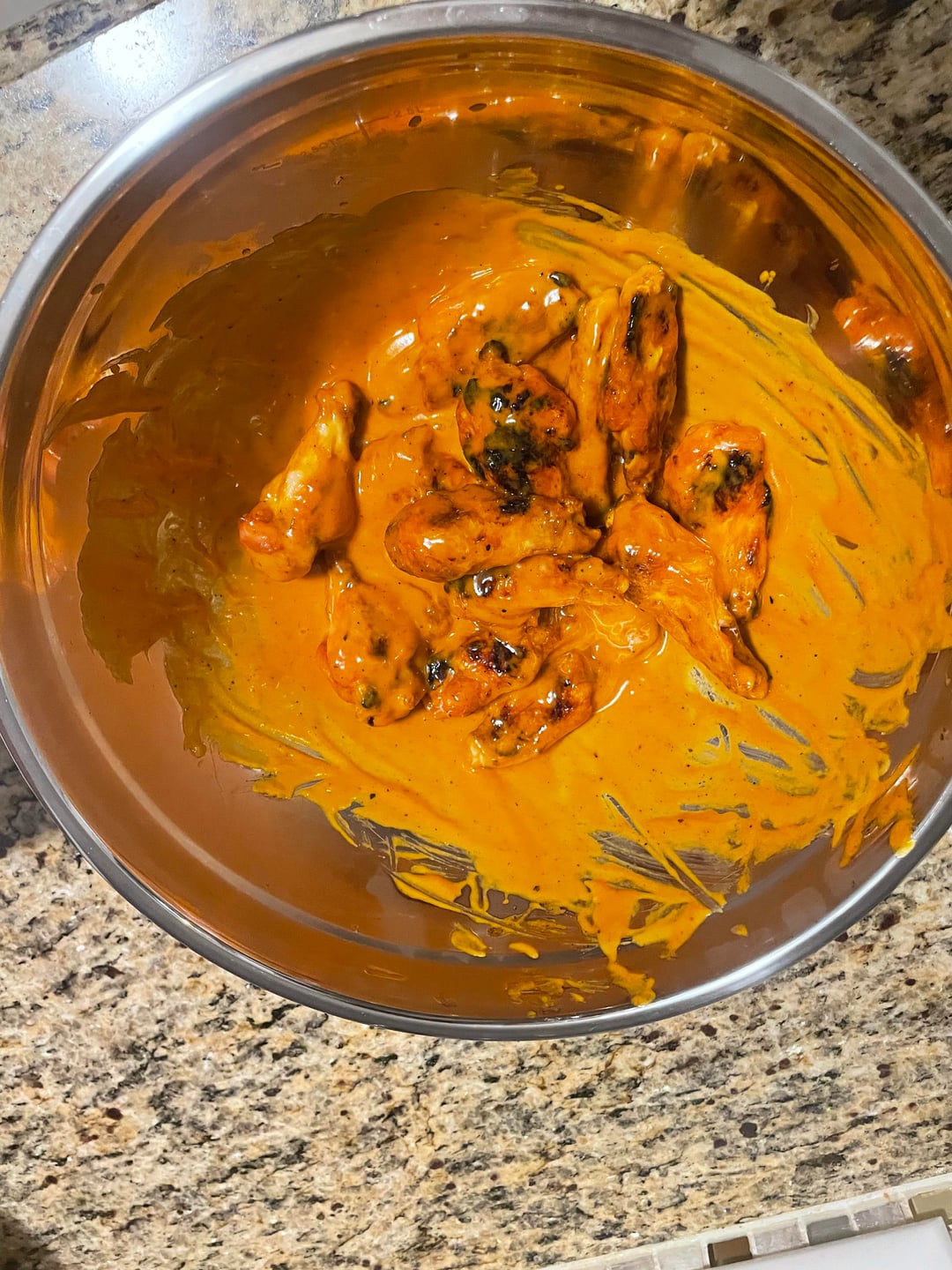 Toss wings in sauce. (Didn’t add the garlic to sauce recipe in pictures but came out amazing)