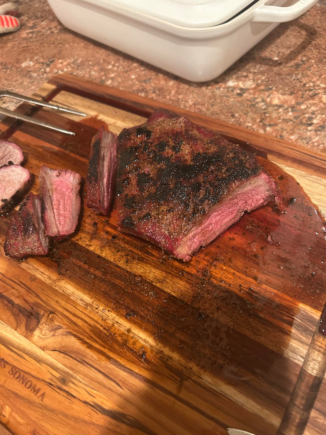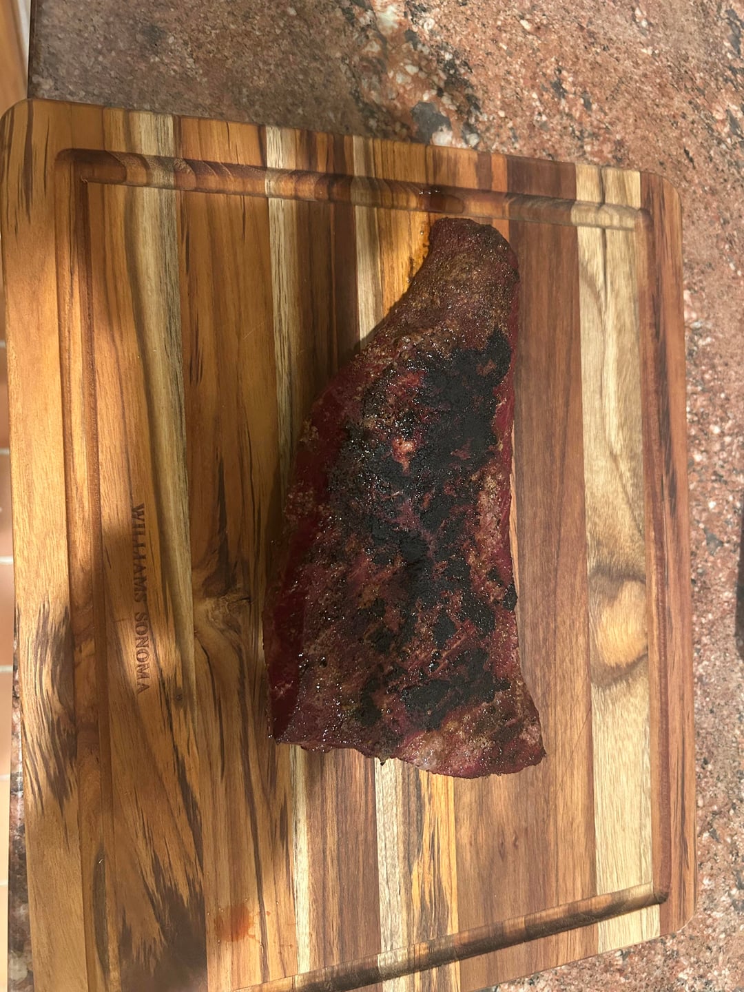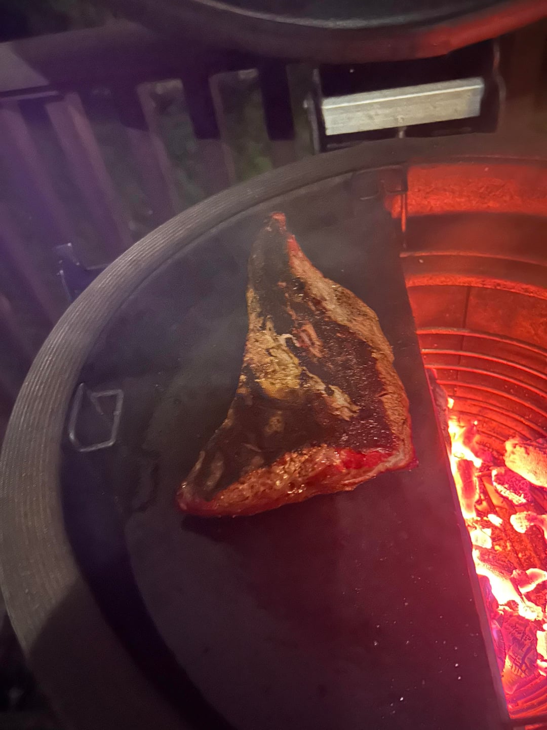 Dry brined (only for about six hours, didn’t make it to the butcher on Thursday), rubbed with garlic, paprika, pepper. 250 for an hour that brought it up to 120, the seared on the soapstone at around 650 for a a minute and one half each side.