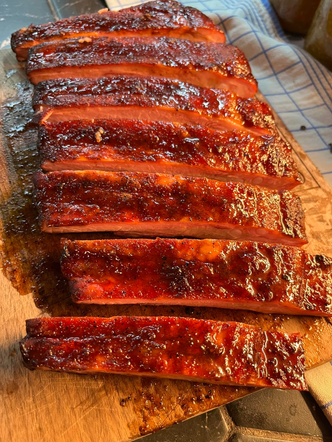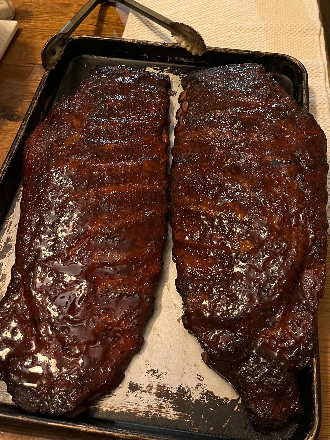 2/1/.5 hour method used (smoke/wrap/glaze). Finished with a vodka rib glaze. These were delicious!