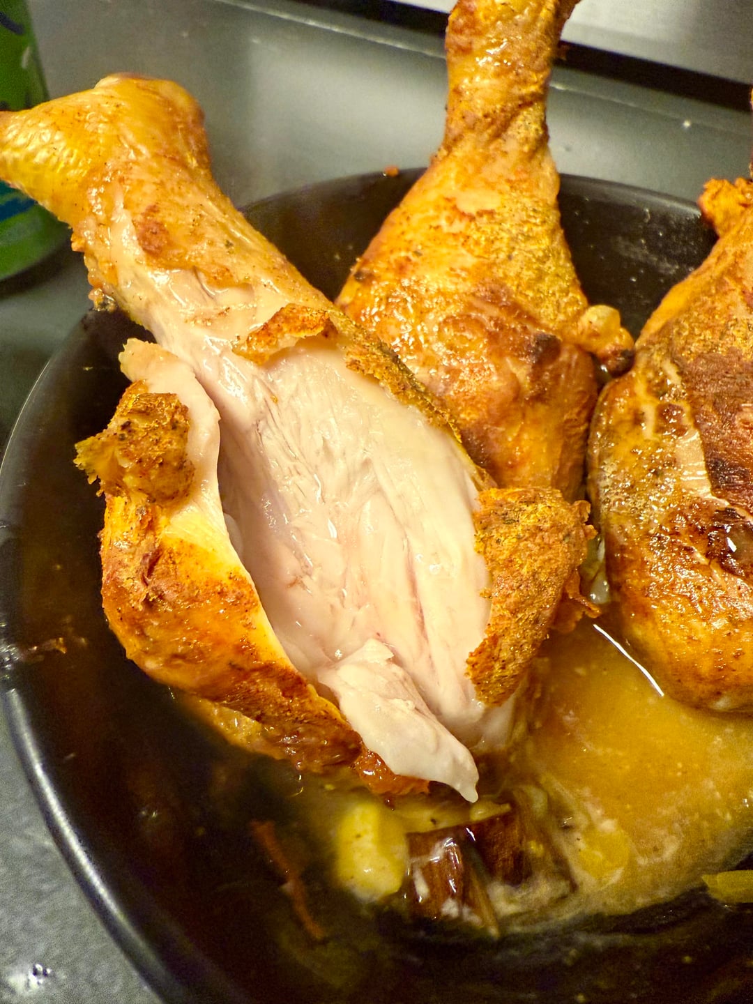 I season the chicken with onion powder, garlic powder, paprika and turmeric before bath time. It’s so juicy, so flavorful, and so cheap!