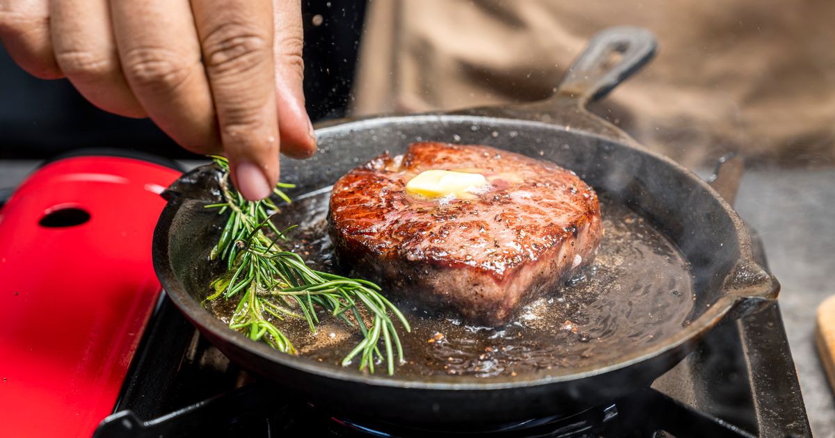 Warm the oil before introducing the steak, placing it gently away from yourself to prevent any oil splattering.