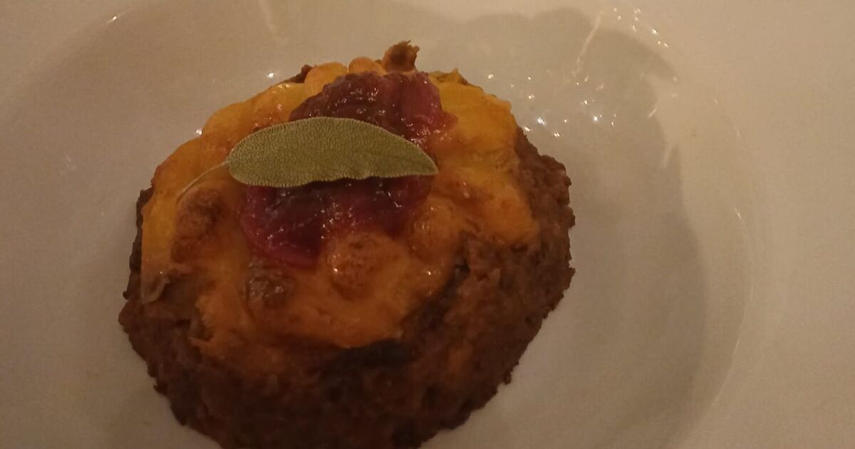 The Christmas shepherd’s pie is made with tender duck, lamb and beef, topped with golden mashed potato, lightly baked sage and orange zest and served with a tangy cranberry chutney and a velvety red wine sauce.