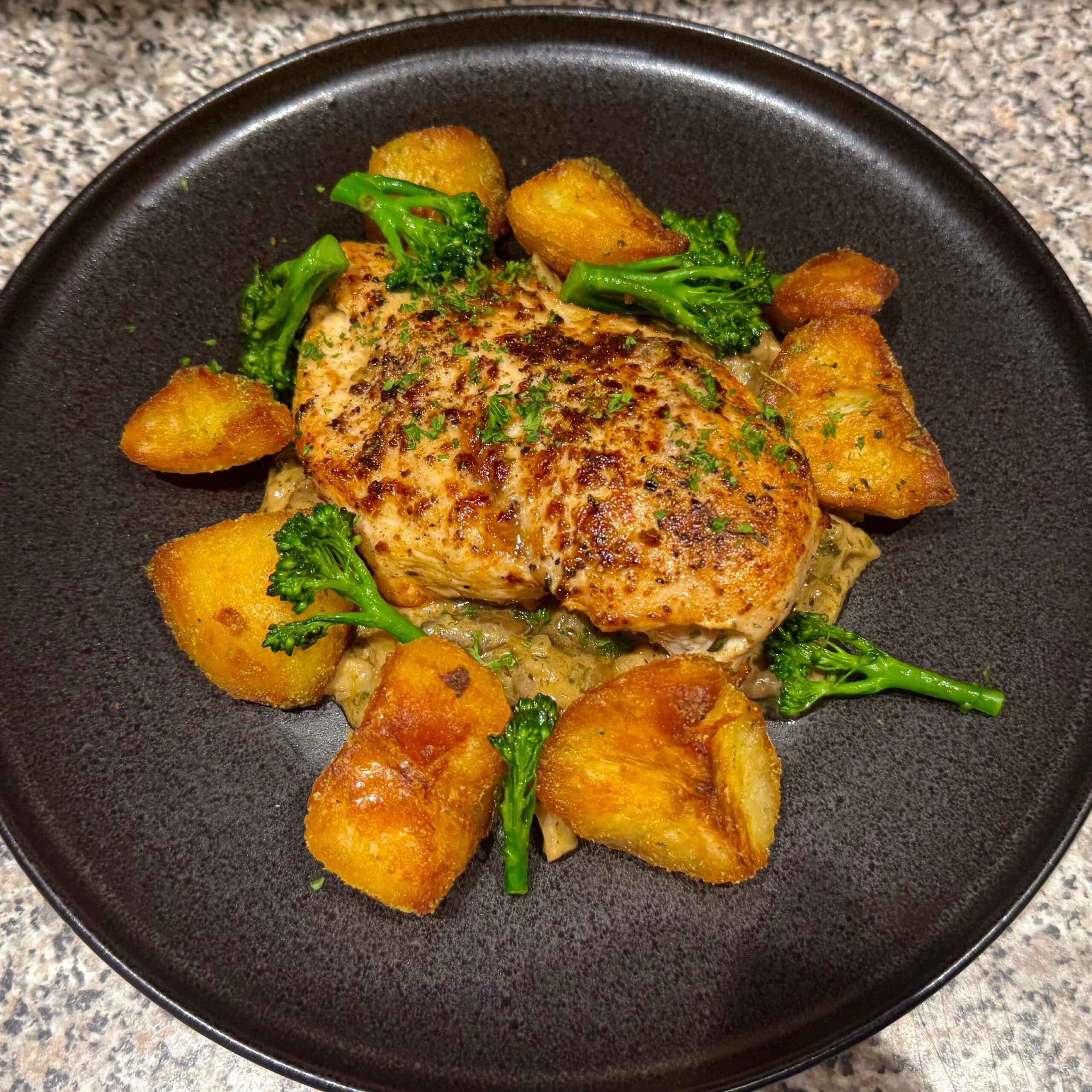Pan seared chicken breast Creamy mushroom white wine sauce Roast potatoes Tenderstem broccoli by Whydoucare- Dining and Cooking