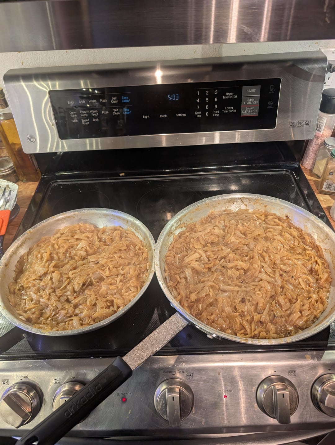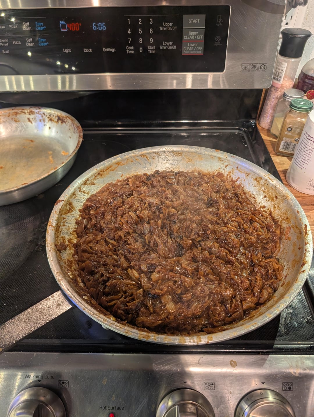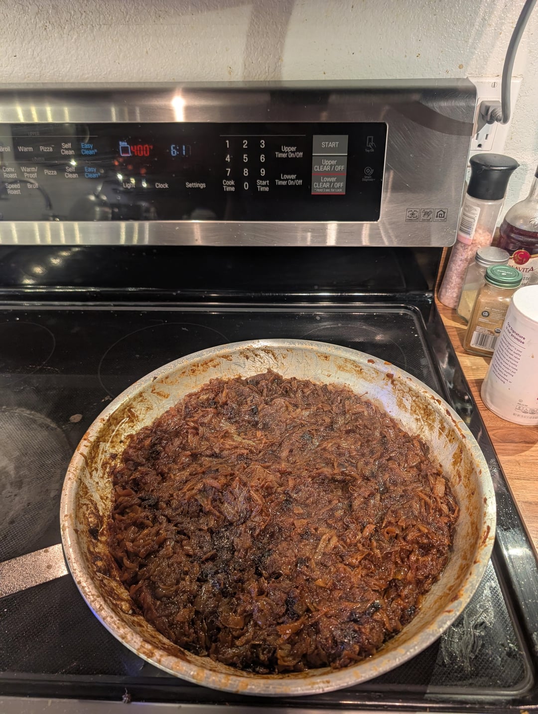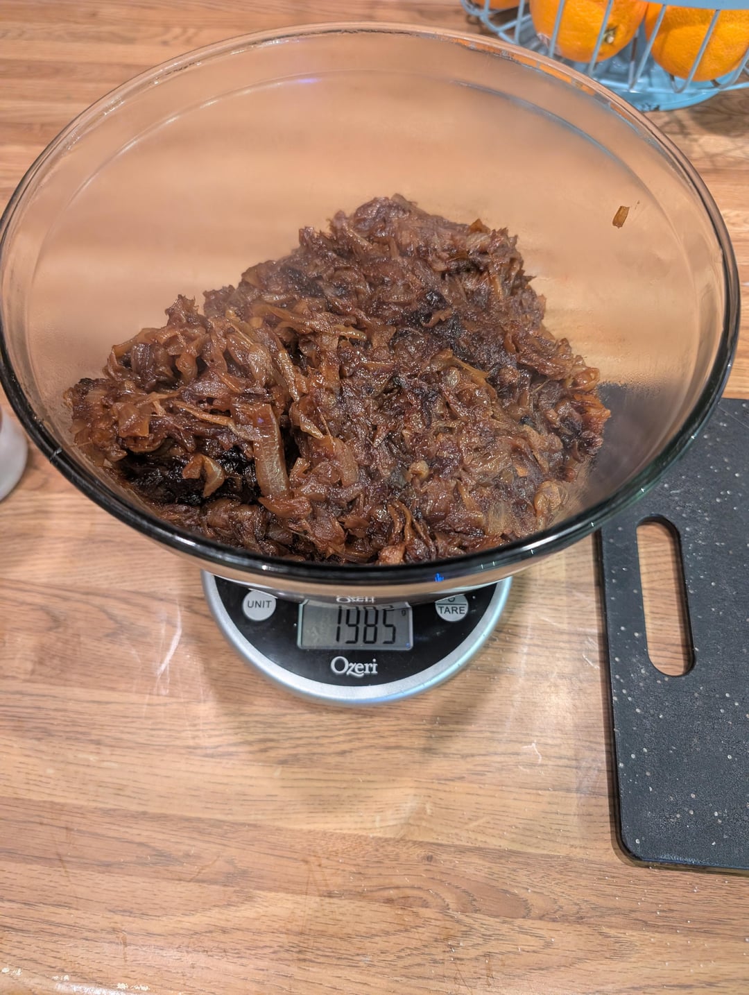 It's been a long time since I've caramelized a big batch of onions. I started with about 16 lb (7.3 kg) of onions from the store. After peeling them, I weighed them and had 6.25 kg. After caramelization was complete, I had 1.99 kg. Start to finish, the process took about 4 hours.