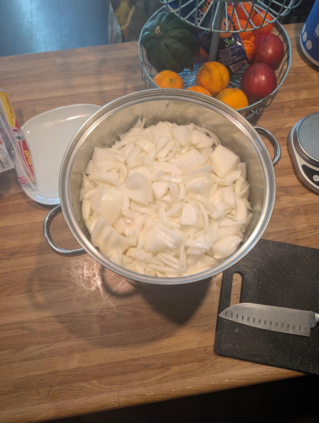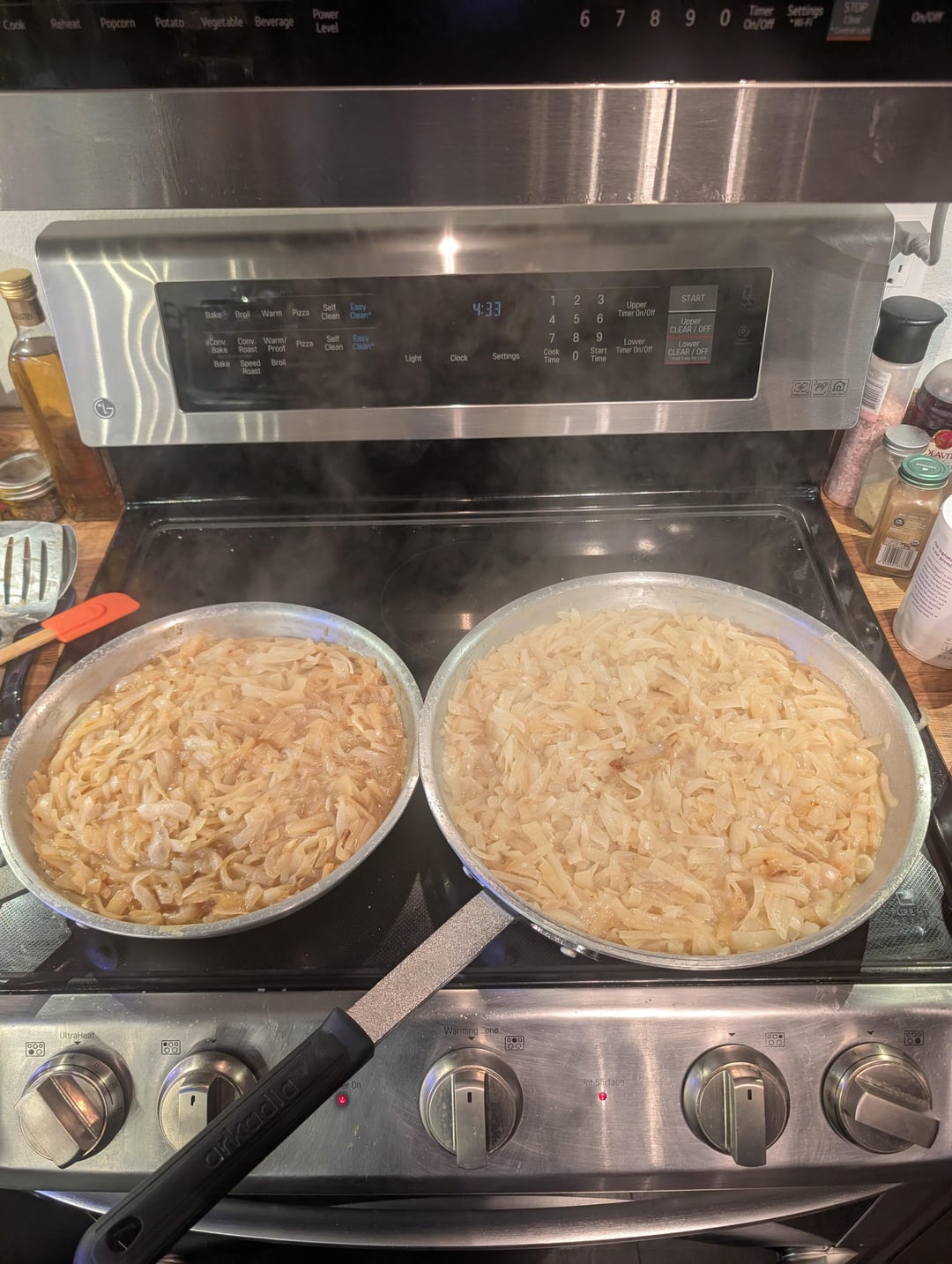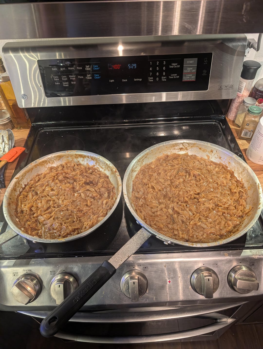 It's been a long time since I've caramelized a big batch of onions. I started with about 16 lb (7.3 kg) of onions from the store. After peeling them, I weighed them and had 6.25 kg. After caramelization was complete, I had 1.99 kg. Start to finish, the process took about 4 hours.