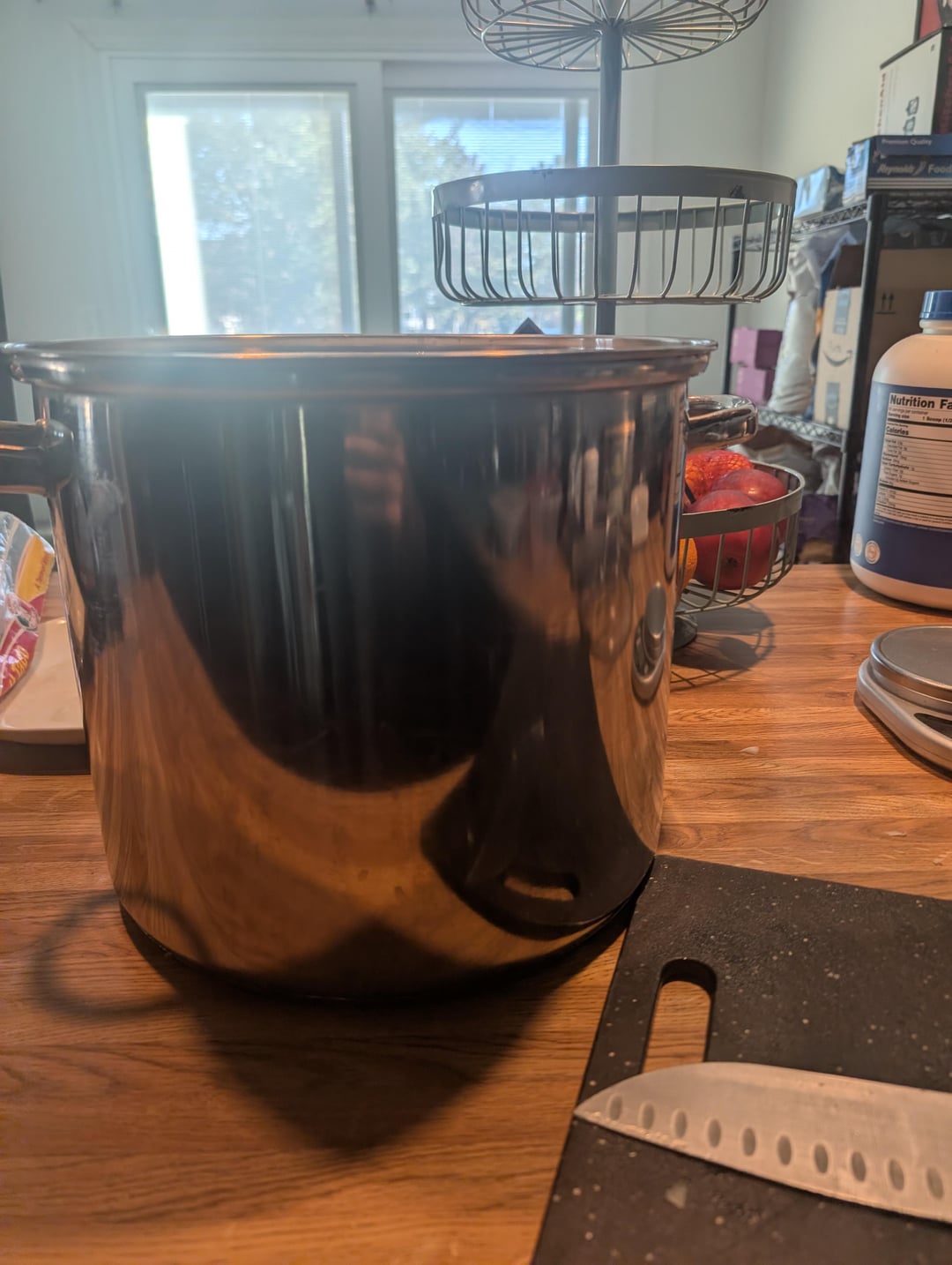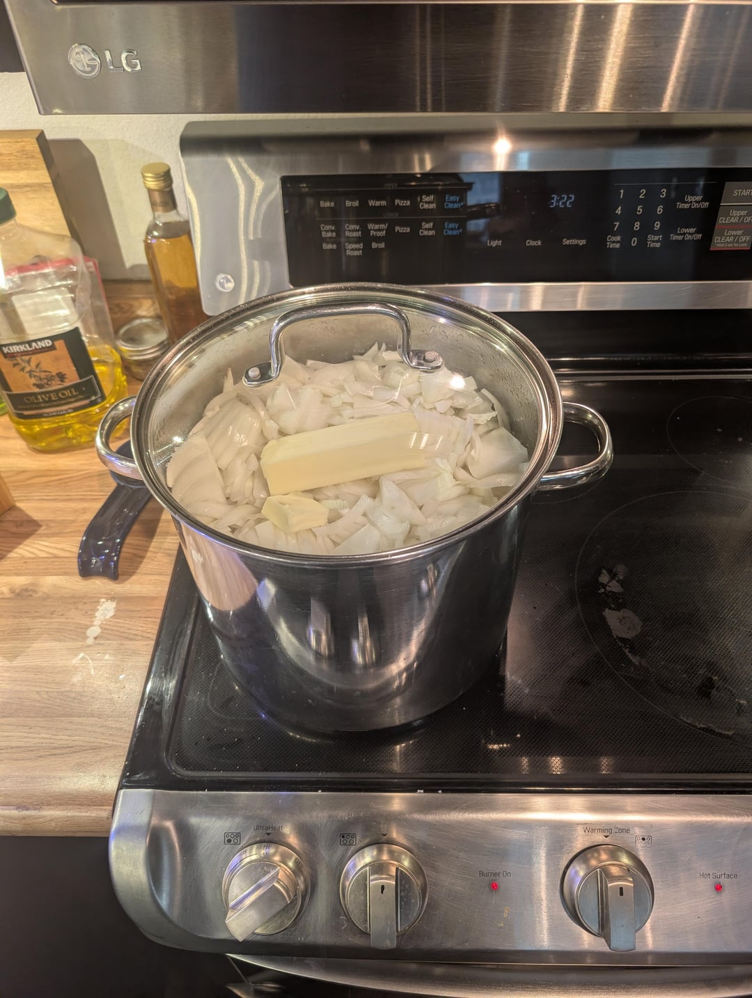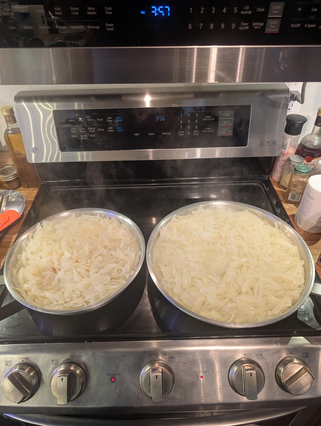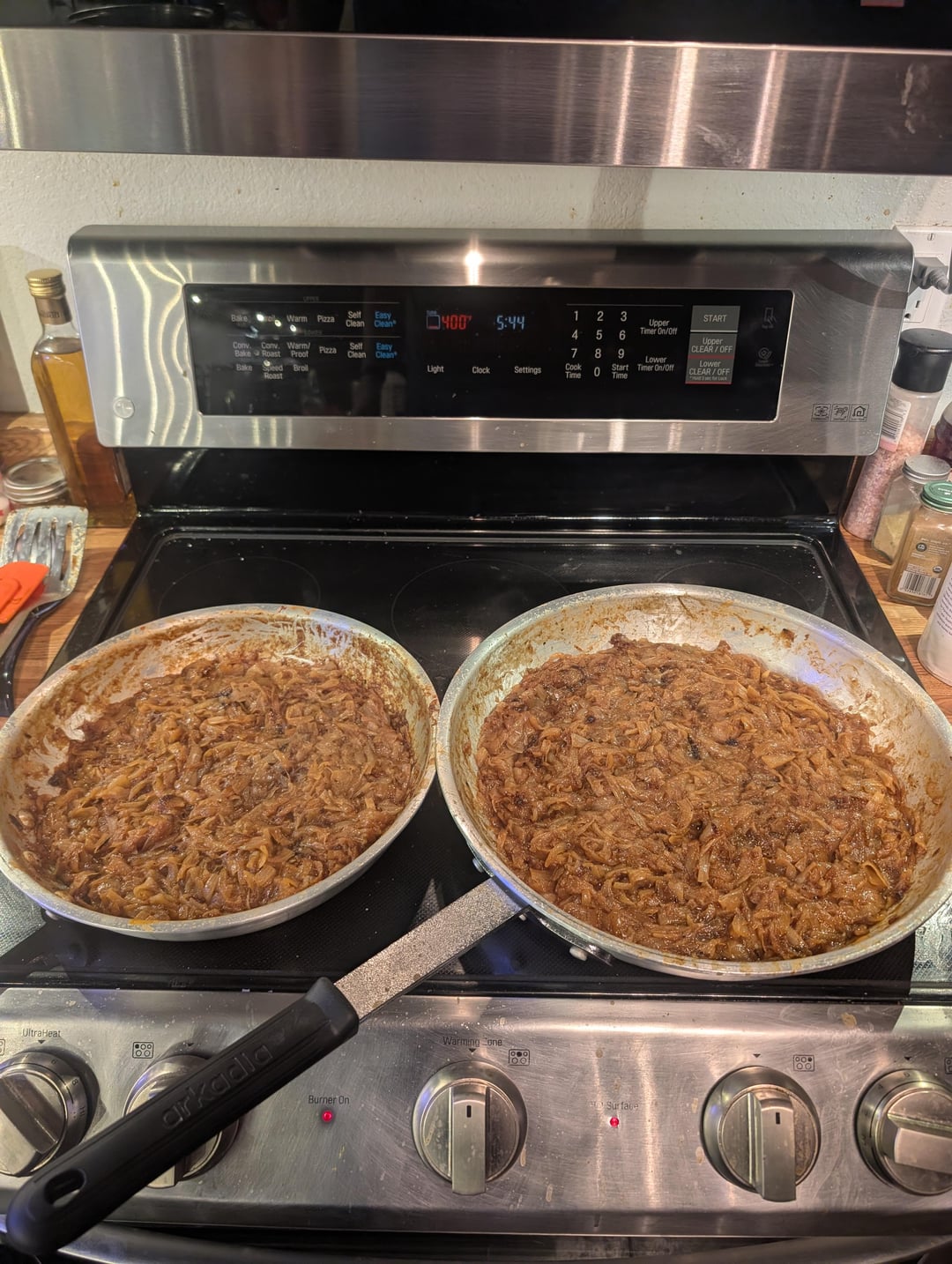 It's been a long time since I've caramelized a big batch of onions. I started with about 16 lb (7.3 kg) of onions from the store. After peeling them, I weighed them and had 6.25 kg. After caramelization was complete, I had 1.99 kg. Start to finish, the process took about 4 hours.